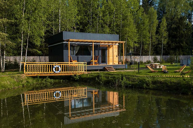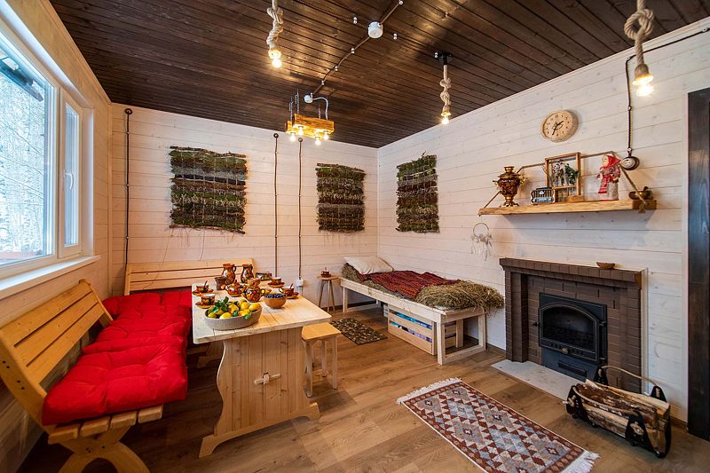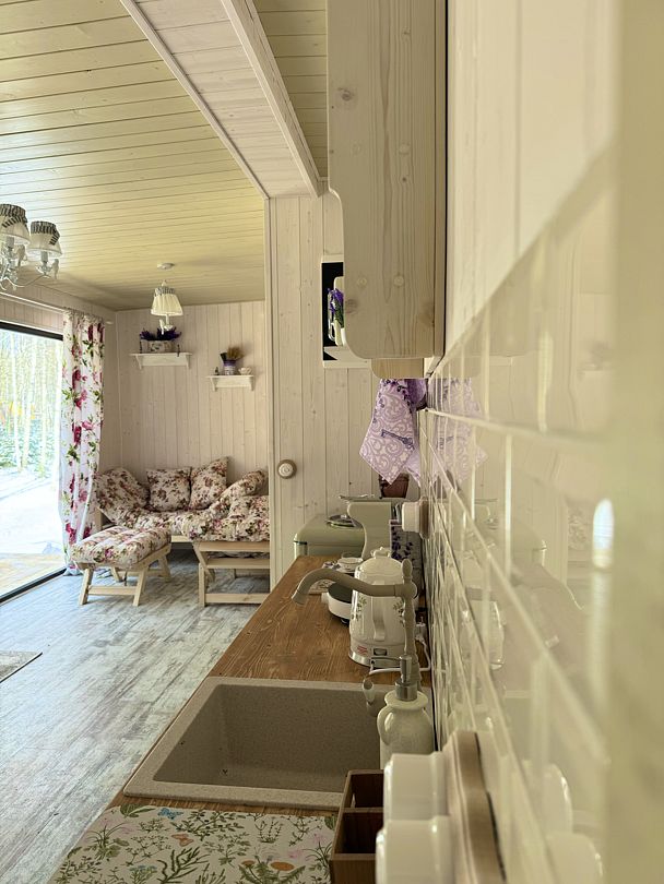 Просторный модульный дом, площадью 44 кв.м., с двумя спальнями. Дизайн интерьера выполнен в русском стиле: дерево и лён, глиняная посуда и предметы интерьера родом из СССР.