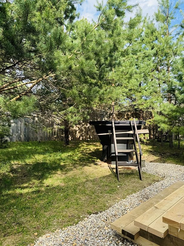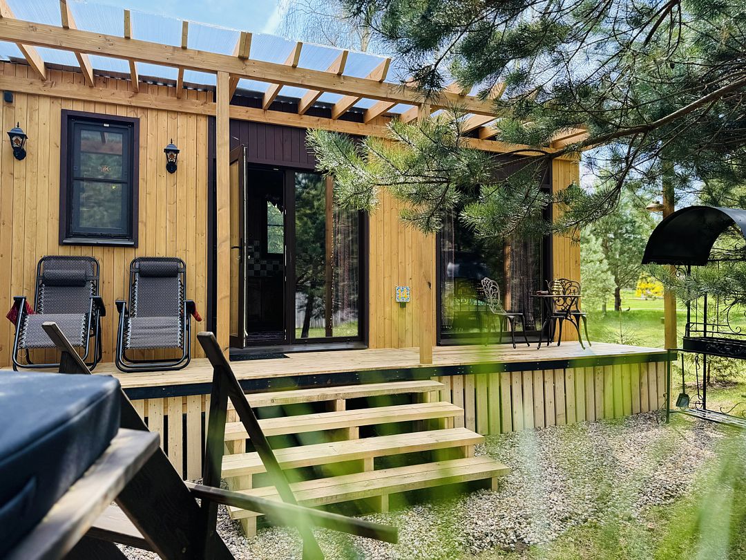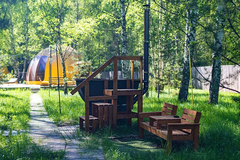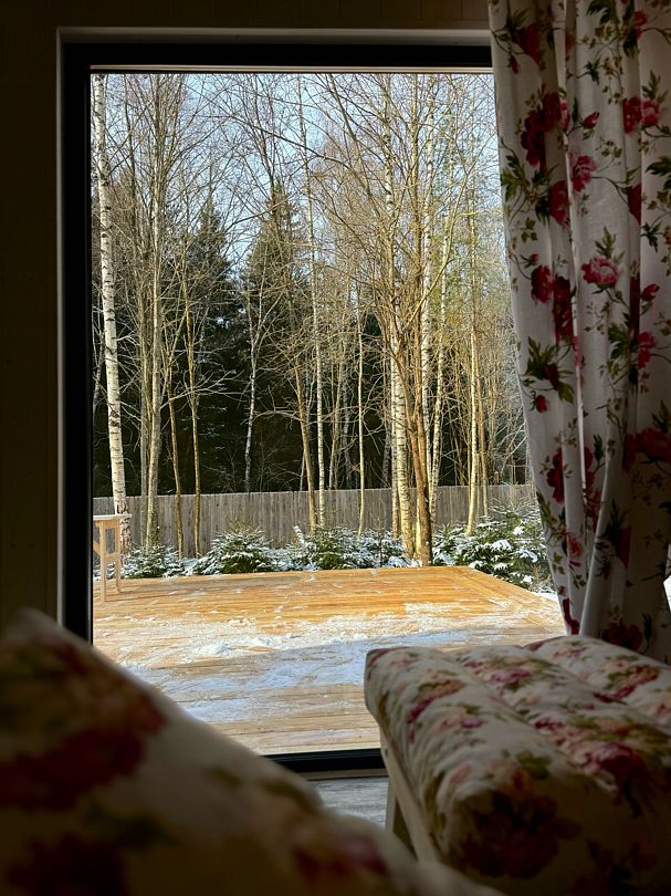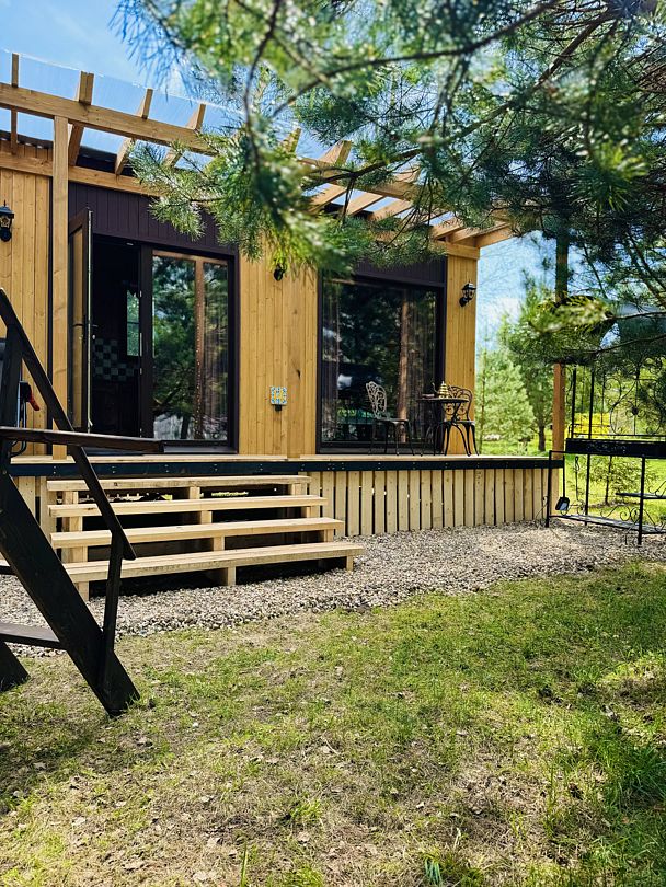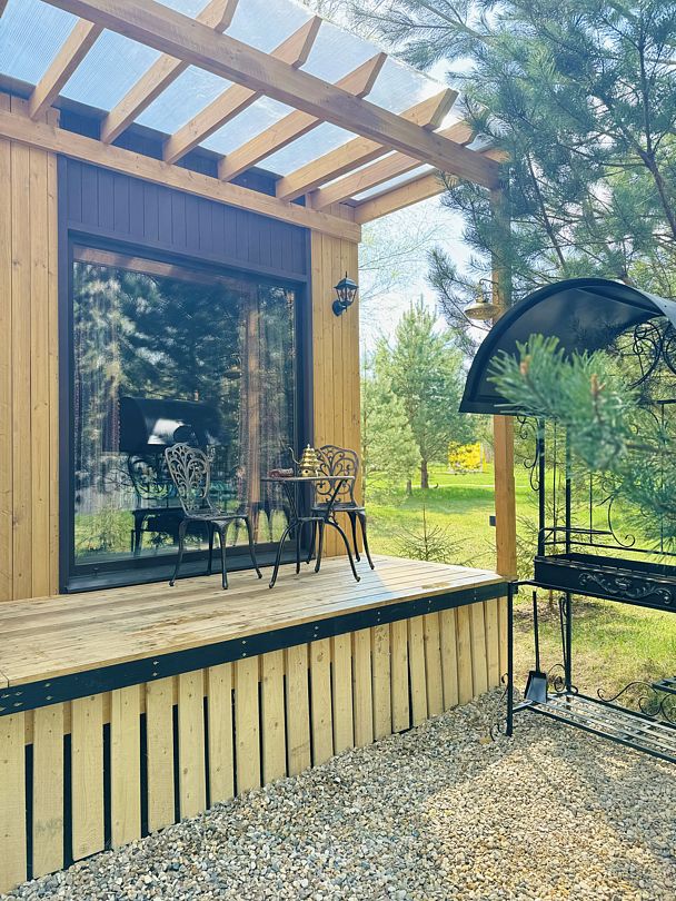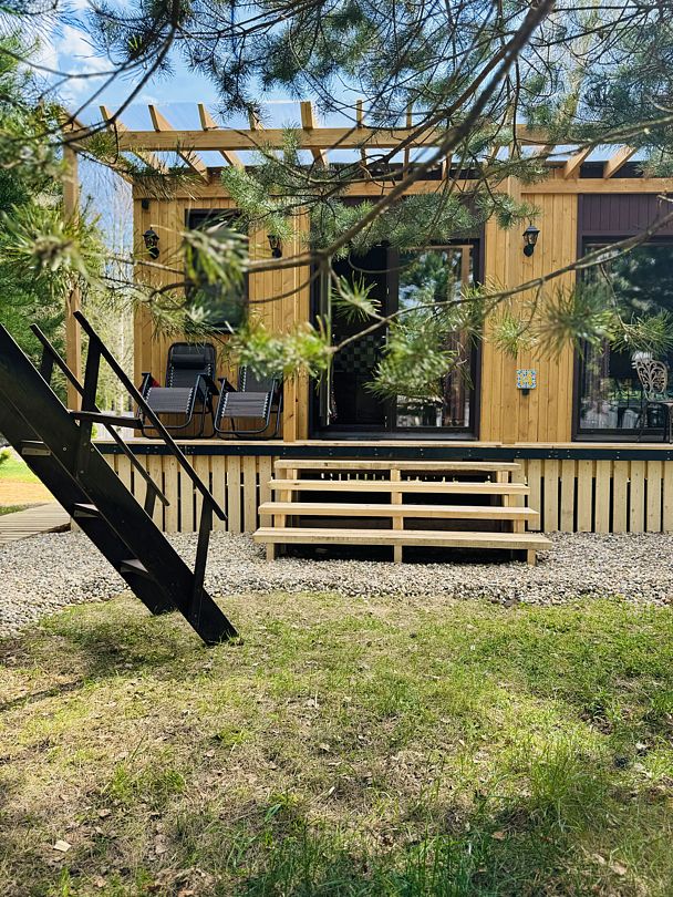 Дом отвернут от территории глэмпинга, поэтому из огромных панорамных окон открывается вид на заповедный лес. И ещё один бонус — личный сад окруженный хвойными деревьями!