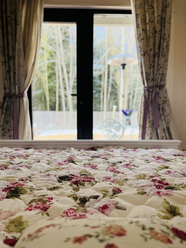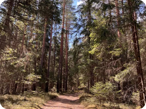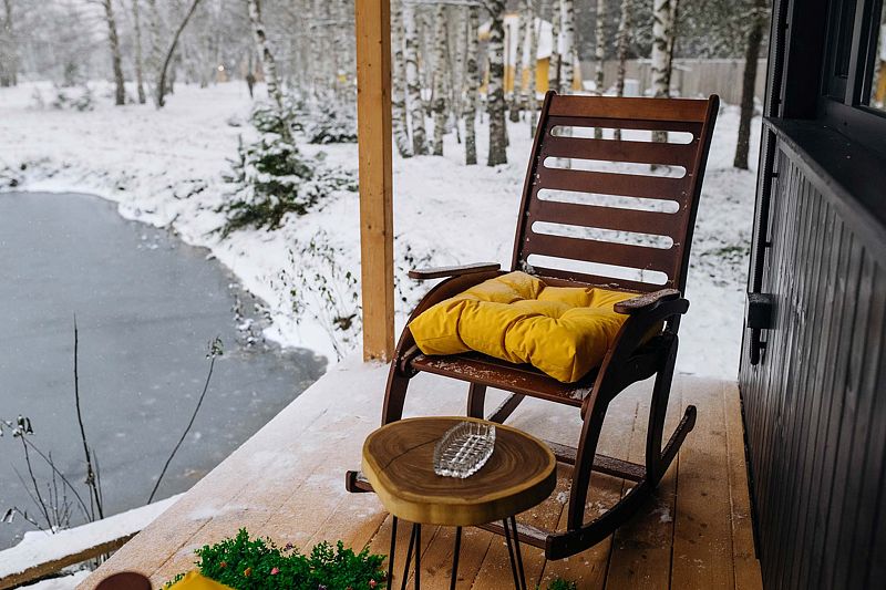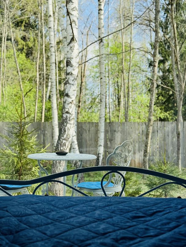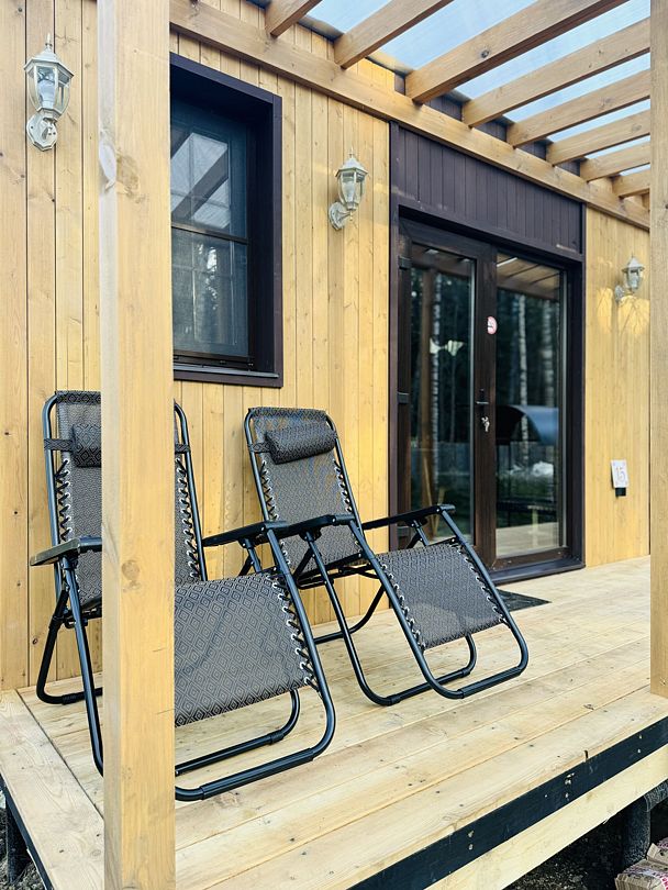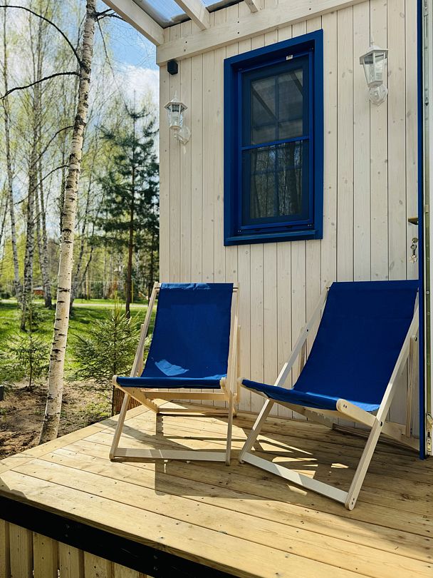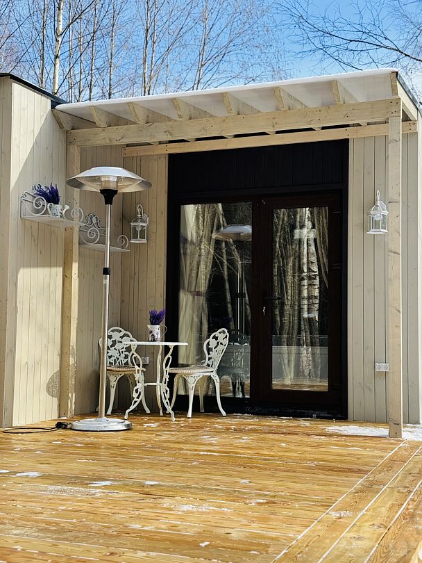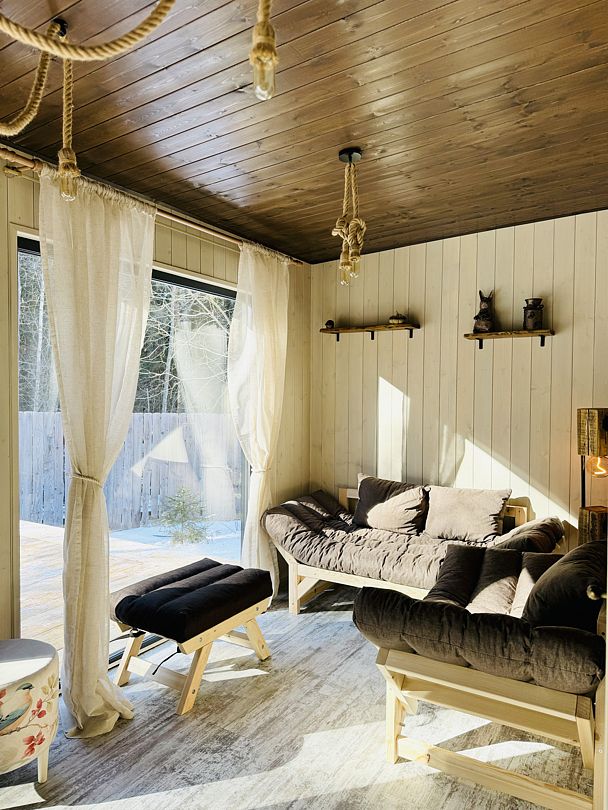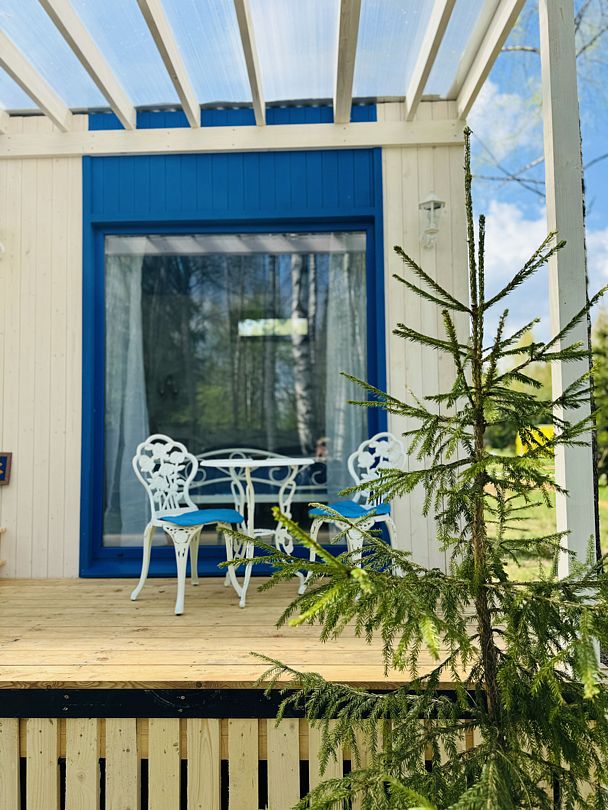 Дом отвернут от территории глэмпинга, поэтому из огромных панорамных окон открывается вид на заповедный лес. И ещё один бонус — личный сад окруженный хвойными деревьями!