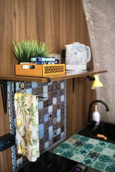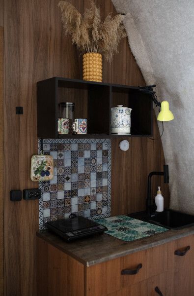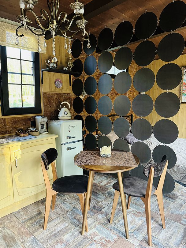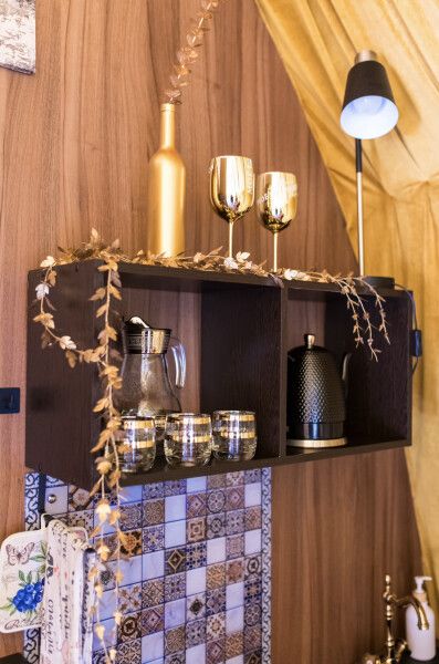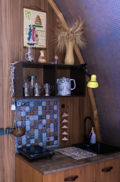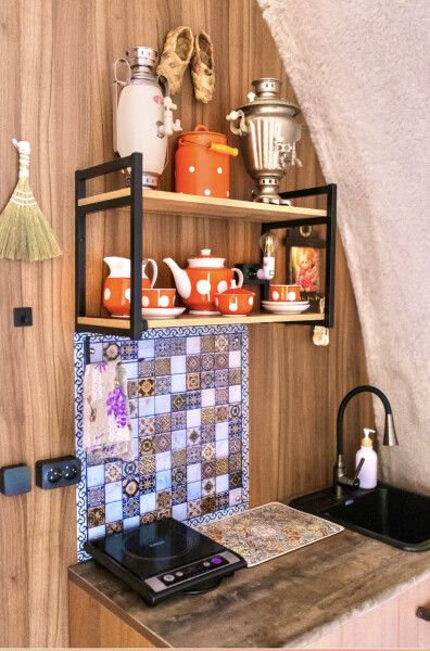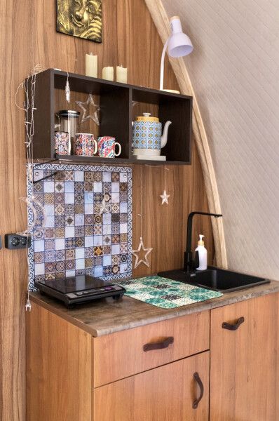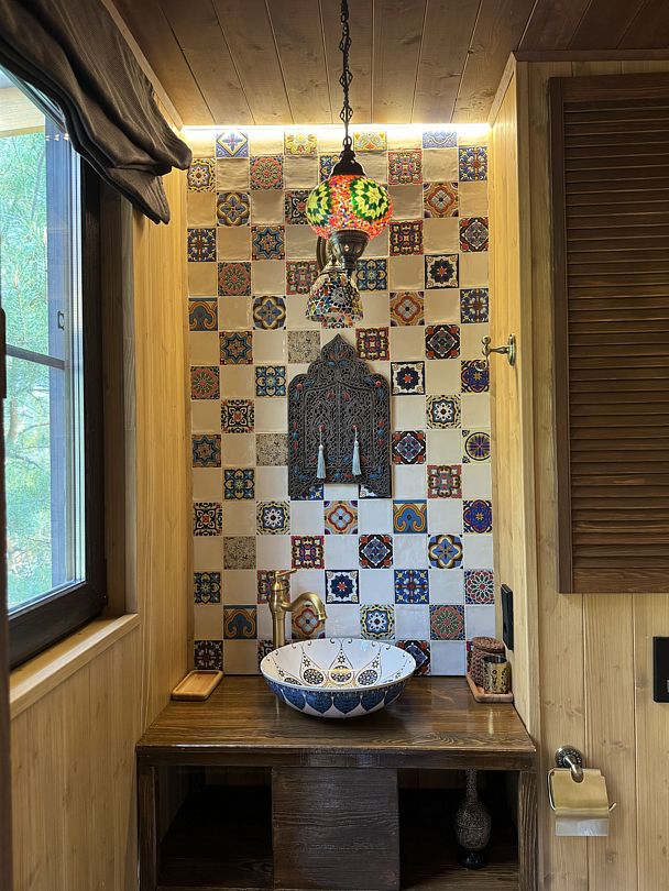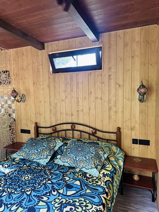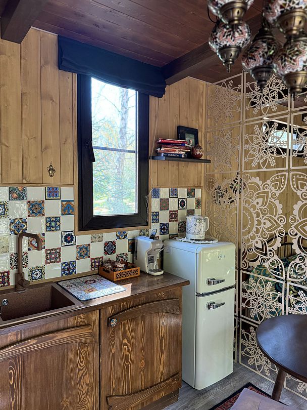 Модульный дом, площадью 21 кв.м., рассчитанный на комфортное размещение двух человек. Дизайн интерьера выполнен в восточном стиле: ручная роспись, мозаика, красочные орнаменты и предметы интерьера из Марокко и Ирана.