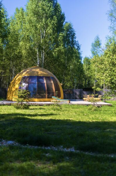 В сфере есть всё необходимое для комфортного отдыха: кондиционер, санузел, душ, фен, кухня со всем необходимым оборудованием и посудой, кофемашина. В вашем распоряжении огромная личная веранда с садовой мебелью, шезлонгом и мангальной зоной. Также в этой сфере есть возможность арендовать горячий банный чан.