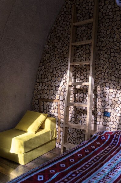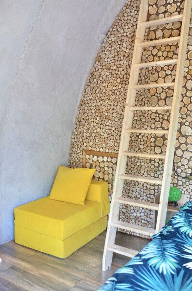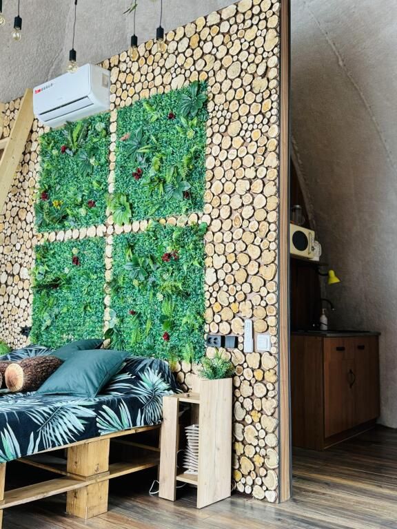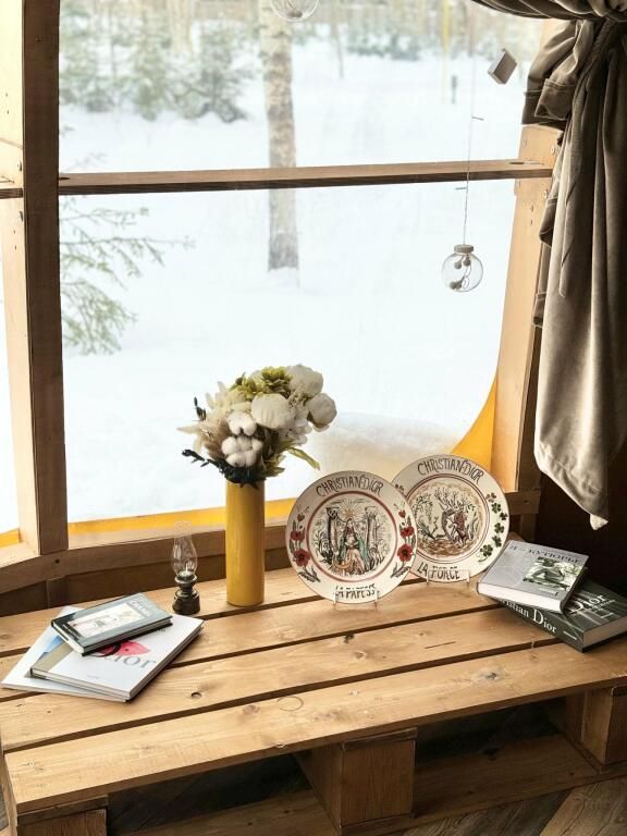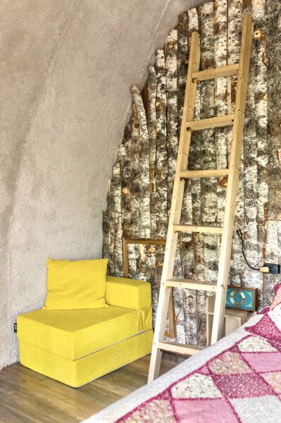 Футуристичная и уютная сфера с можжевеловой стеной и предметами интерьера из можжевельника, обшитая мягким, плюшевым мехом в светлых тонах. Из панорамного окна сферы открывается роскошный вид на лес.