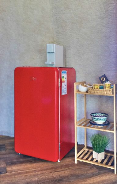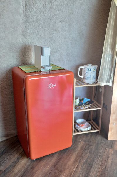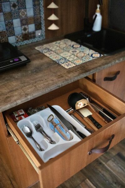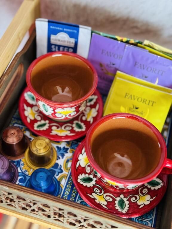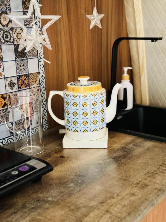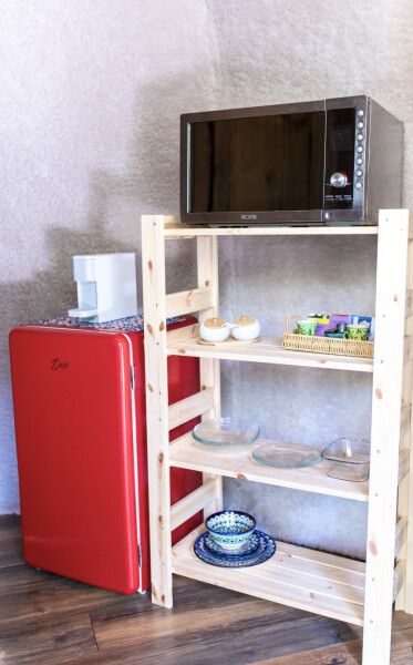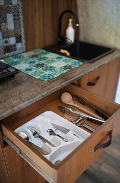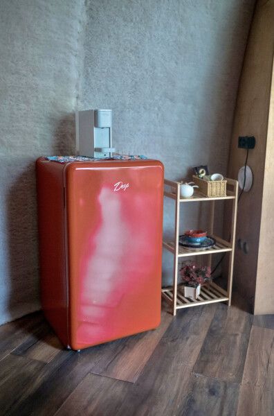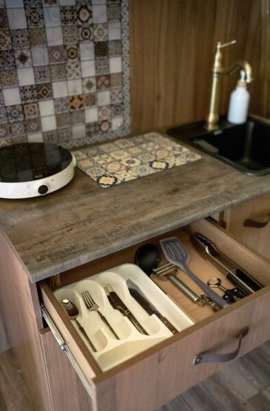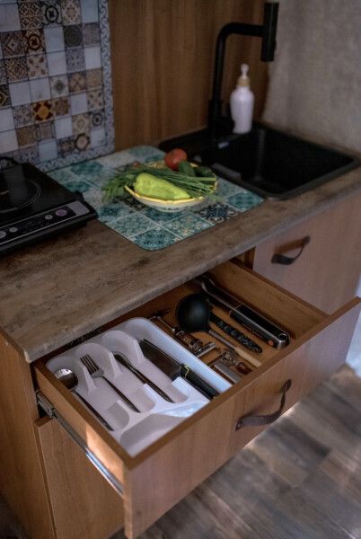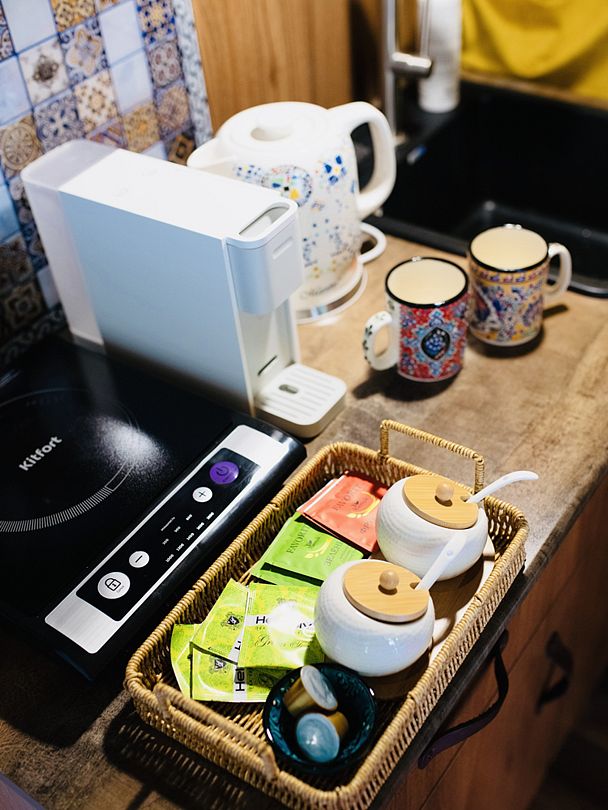 В каждом домике своя мини кухня: плита, холодильник, электрический чайник+ чайные пакетики, капсульная кофе машина + капсулы, вся необходимая кухонная утварь (чашки, тарелки, ложки, сковорода, кастрюля и т.д.).