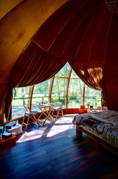 Дом отвернут от территории глэмпинга, поэтому из огромных панорамных окон открывается вид на заповедный лес.