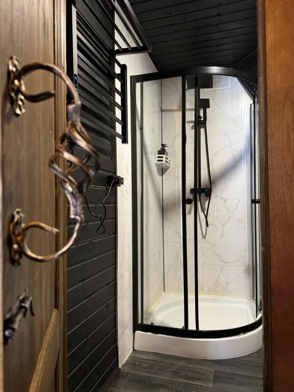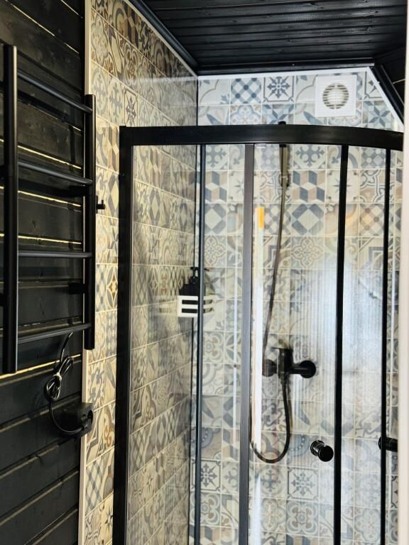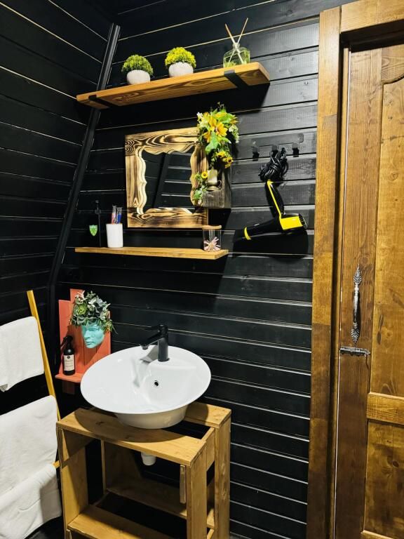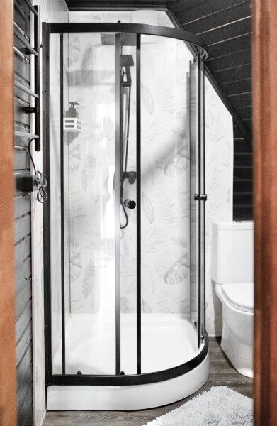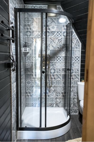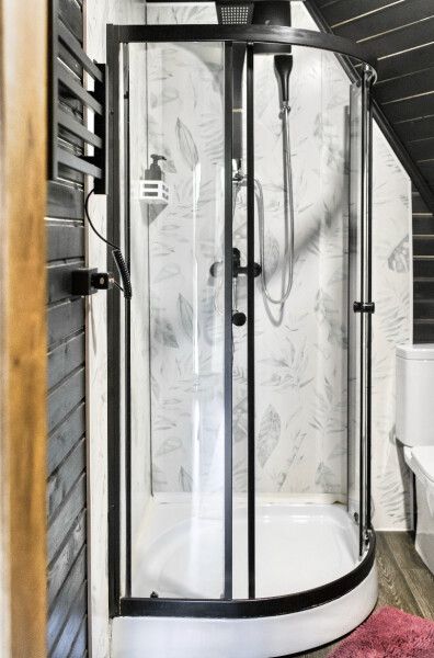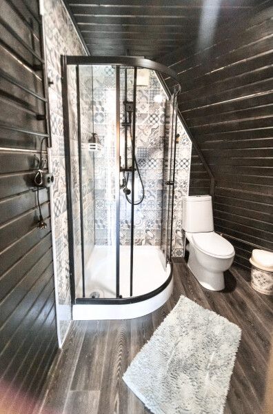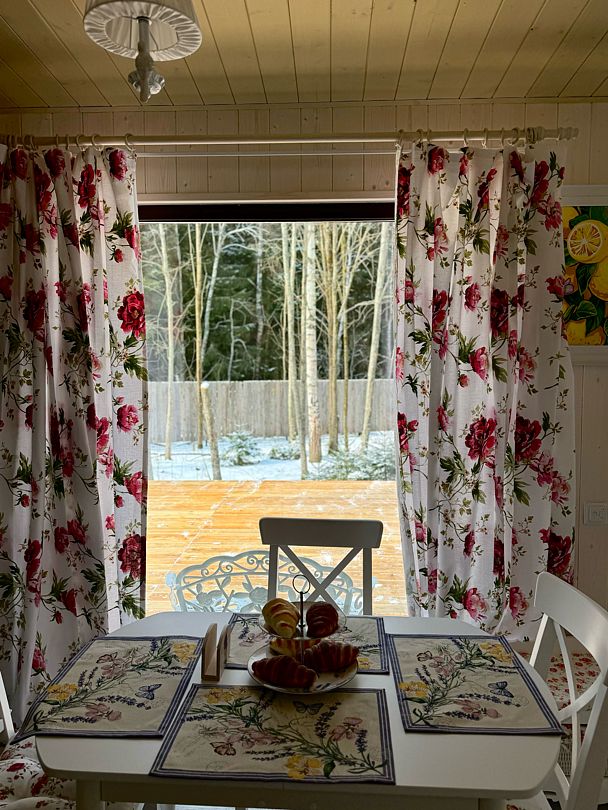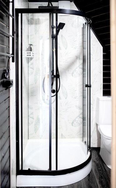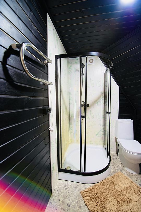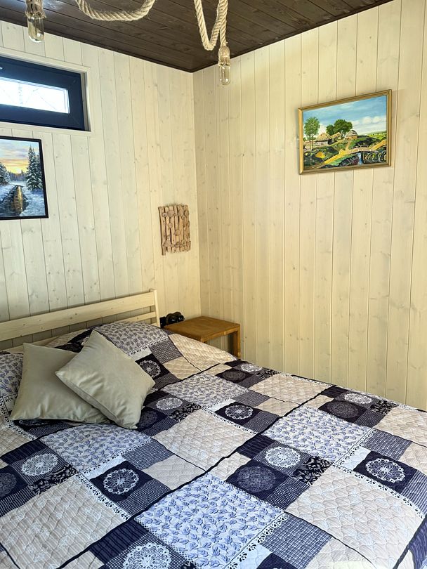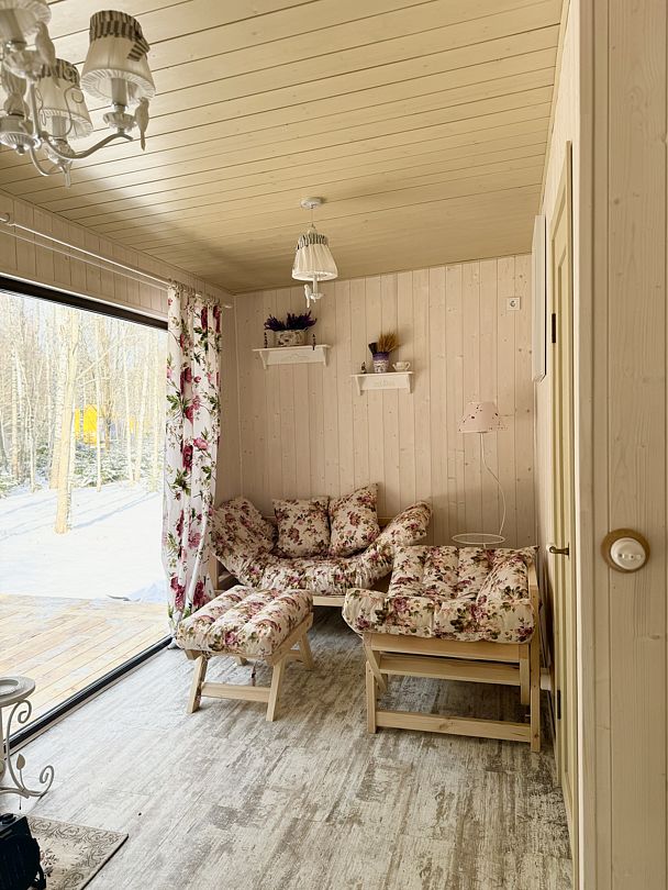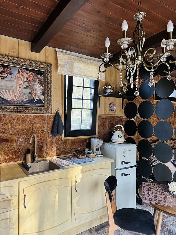 В доме есть все необходимое для комфортного проживания: большая кухня со всей необходимой посудой, холодильником, плитой, чайником, кофемашиной + капсулы, микроволновой печью. Зонированная спальня с двуспальной кроватью и панорамным окном с видом на лес, а также ванная комната с просторной душевой.