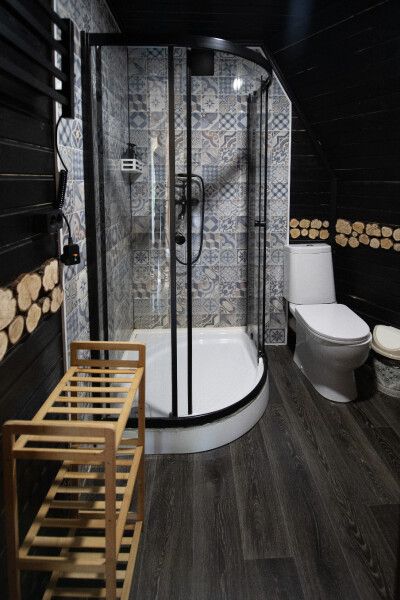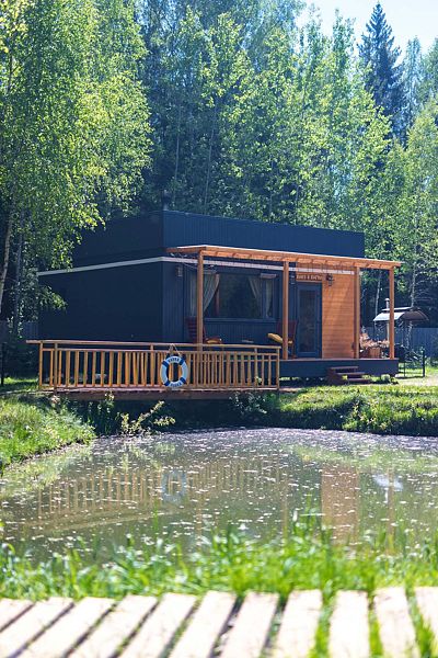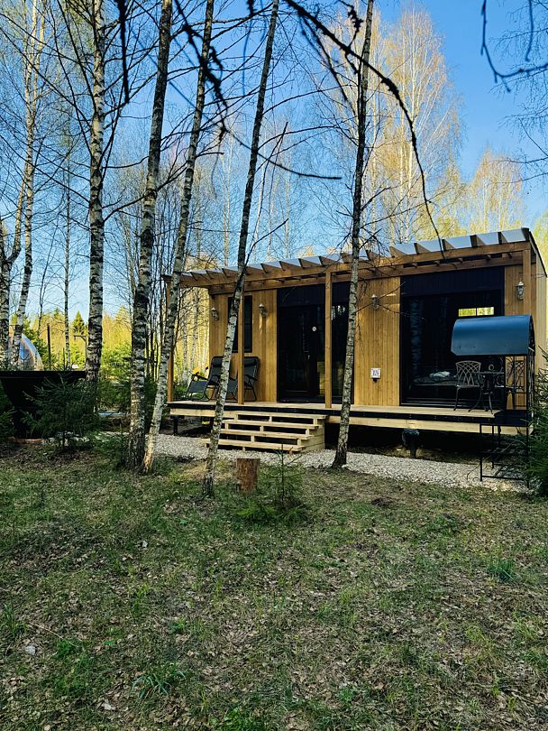 Дом отвернут от территории глэмпинга, поэтому из огромных панорамных окон открывается вид на заповедный лес. И ещё один бонус — собственный выход в лес!