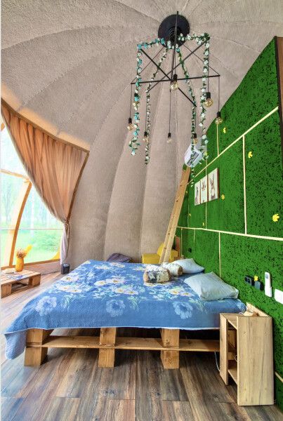 Футуристичная и уютная сфера, обшитая мягким и плюшевым мехом в светлых тонах. В сфере много зелени и цветов, чтобы даже внутри вы могли чувствовать, что вы на природе.