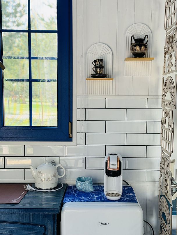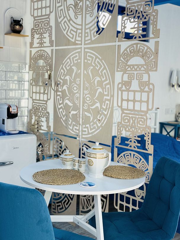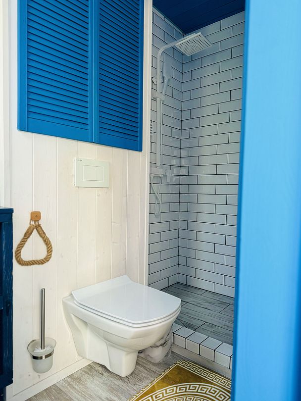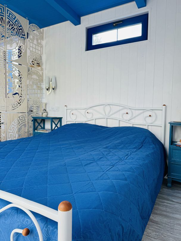 Модульный дом, площадью 21 кв.м., рассчитанный на комфортное размещение двух человек. Дизайн интерьера выполнен в греческом стиле: сочетание белых и синих оттенков, массивные потолочные балки, элементы декора, отображающие местный колорит и предметы интерьера с острова Санторини.