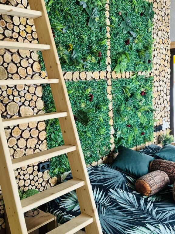 Футуристичная и уютная сфера, обшитая мягким и плюшевым мехом в светлых тонах. В сфере много зелени, а также предметов интерьера из можжевельника.