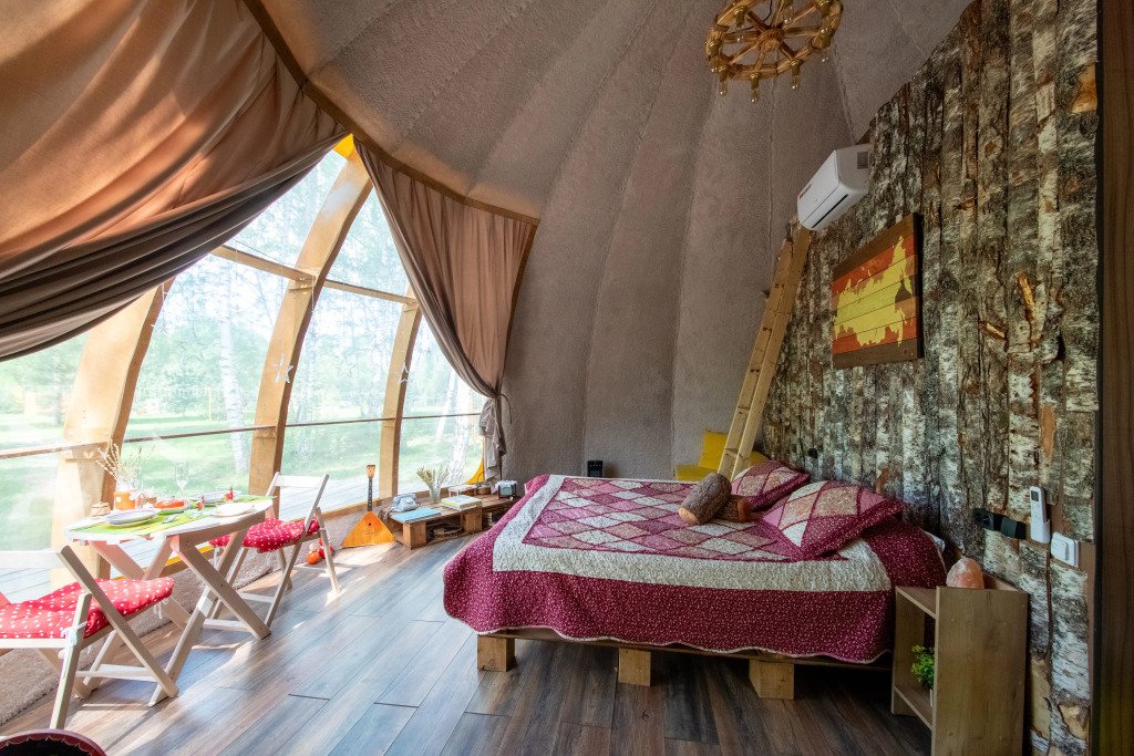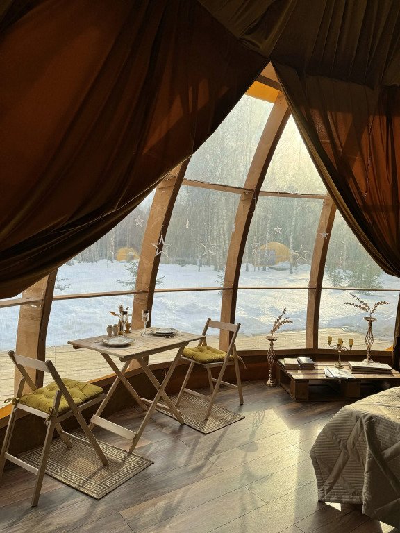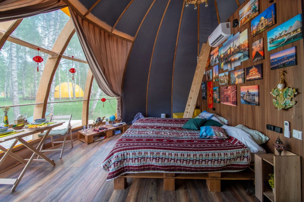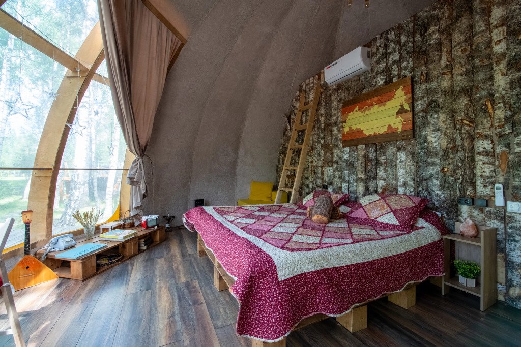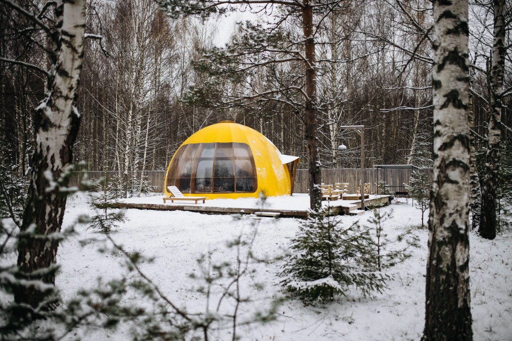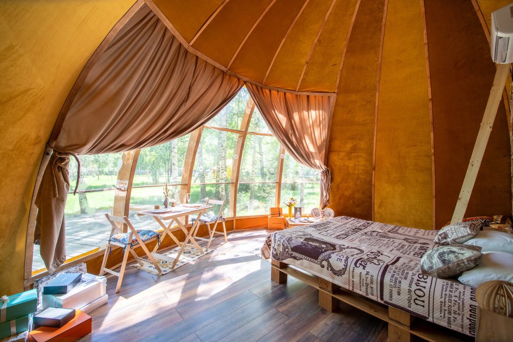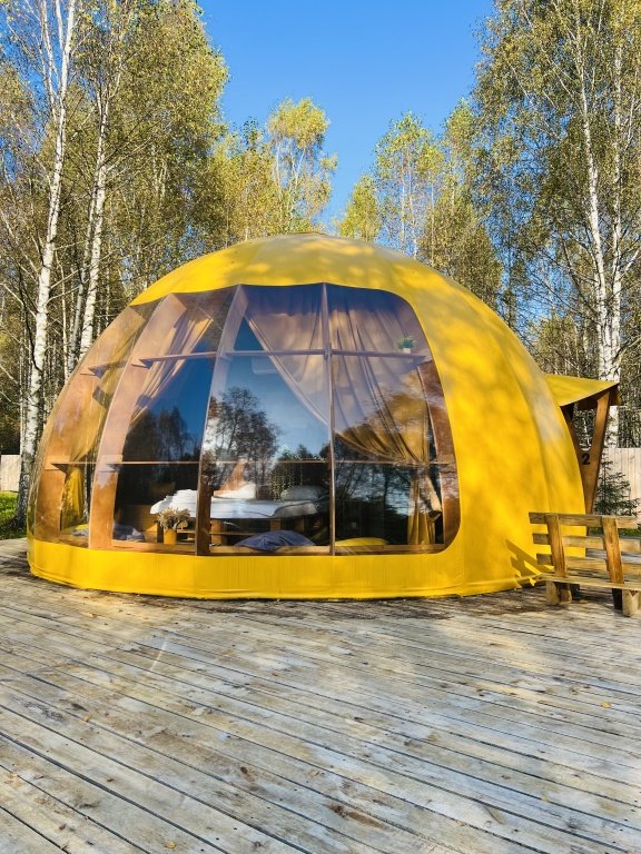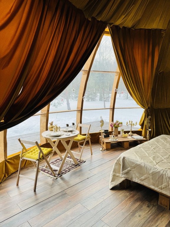 На территории глэмпинга доступны 10 купольных домиков-сфер, 2 семейных дома с 2 спальнями и гостиной, а также 3 дома для 2 гостей. Дома оборудованы необходимыми удобствами для проживания в любое время года. Удобства: кухня с техникой и посудой, кофемашина с капсулами, чай, фен, полотенца, постельное бельё, косметика для душа, терраса с мангальной зоной, шезлонг. Для маленьких детей предоставляется кровать-манеж. Из каждого панорамного окна открывается вид на лес.