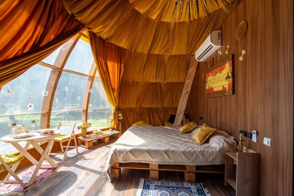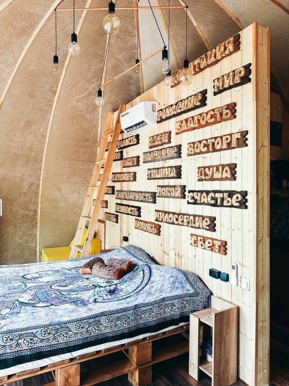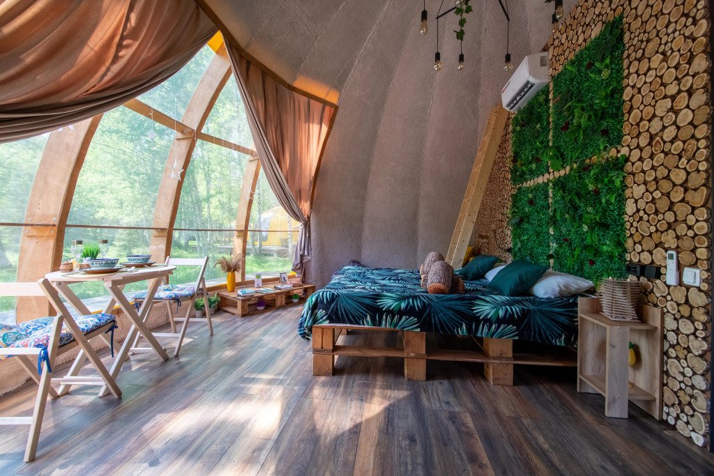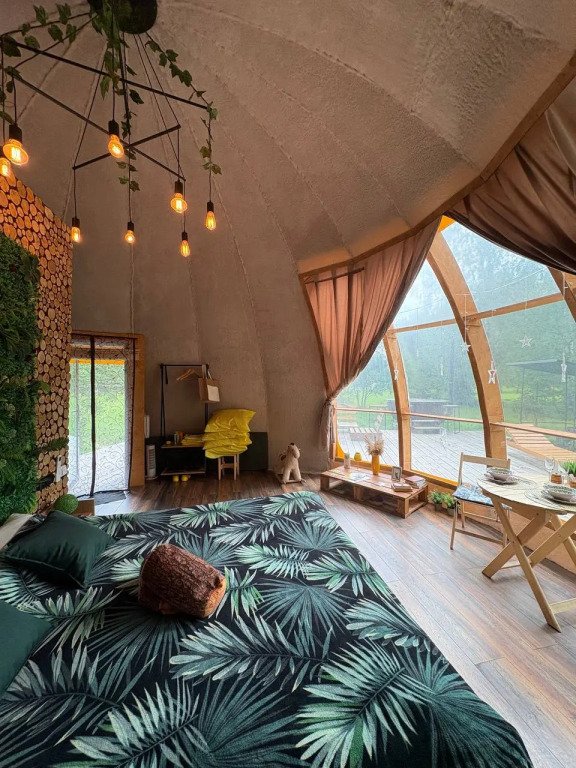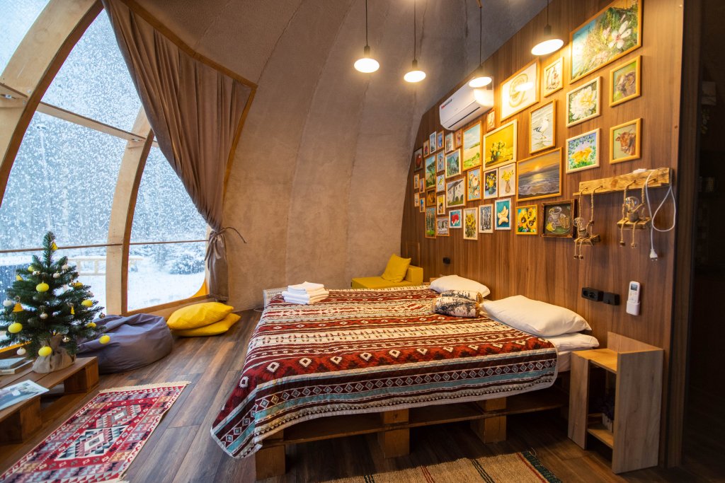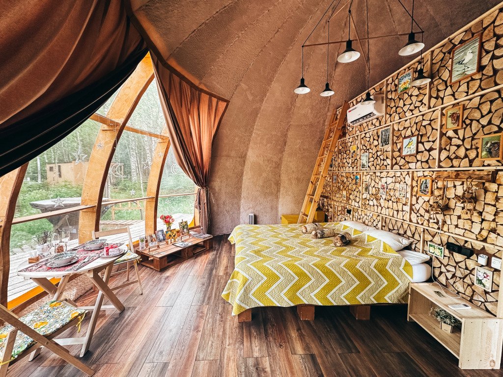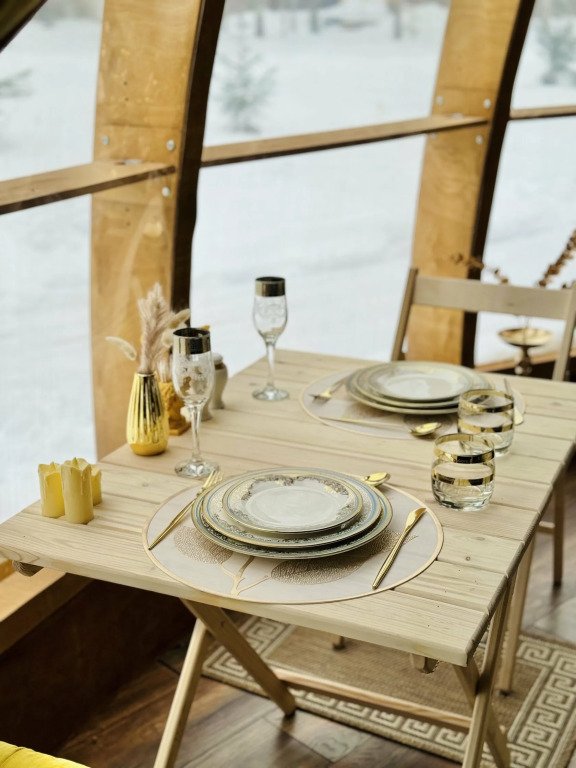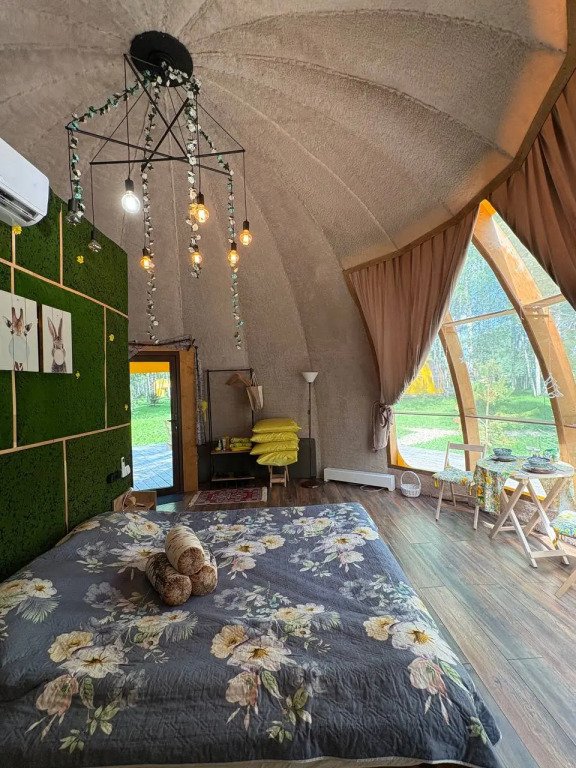 На территории глэмпинга доступны 10 купольных домиков-сфер, 2 семейных дома с 2 спальнями и гостиной, а также 3 дома для 2 гостей. Дома оборудованы необходимыми удобствами для проживания в любое время года. Удобства: кухня с техникой и посудой, кофемашина с капсулами, чай, фен, полотенца, постельное бельё, косметика для душа, терраса с мангальной зоной, шезлонг. Для маленьких детей предоставляется кровать-манеж. Из каждого панорамного окна открывается вид на лес.