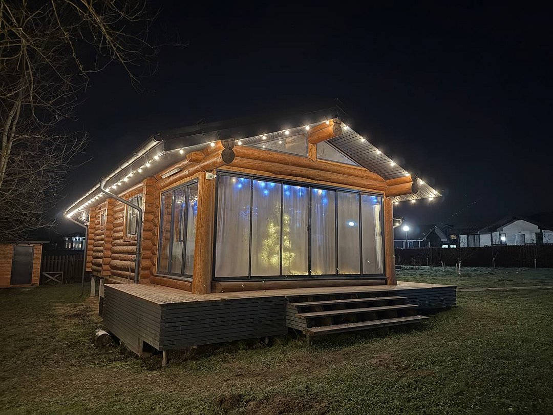 Здесь вас ждет продуманное пространство, объединяющее спальню, кухню-гостиную и современный санузел с душевой. Снаружи расположена просторная застеклённая веранда, мангал с навесом и грилем, уютная костровая чаша, а также парковка на два автомобиля с автоматическими воротами. Для детей оборудован игровой домик на дереве, а для вечернего отдыха — ночная подсветка костровой зоны и большая лужайка для игр на свежем воздухе.