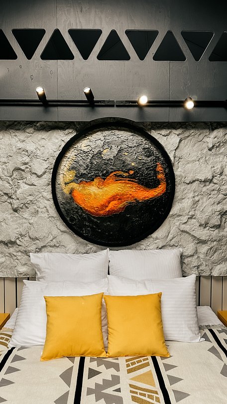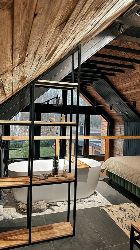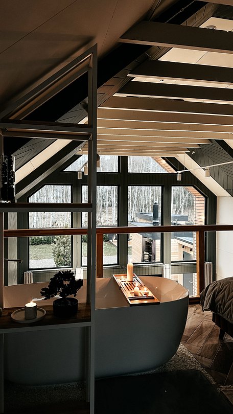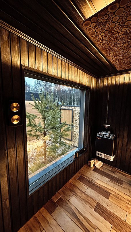 Внутри есть все для комфортного отдыха: два двуспальных места, телевизор, умный дом «Алиса», дровяной чугунный камин, душевая, ванна с панорамным видом, кухня со всеми принадлежностями. Территория дома обособленна, на свежем воздухе к Вашим услугам: сауна, бассейн, банный чан, комплекс барбекю, кострище, детская площадка, зона отдыха с летним кинотеатром и настольными играми.