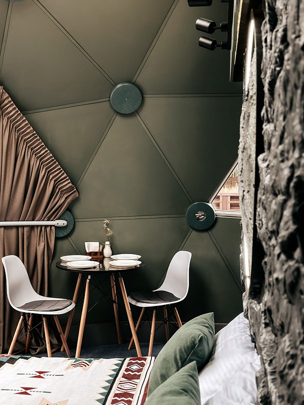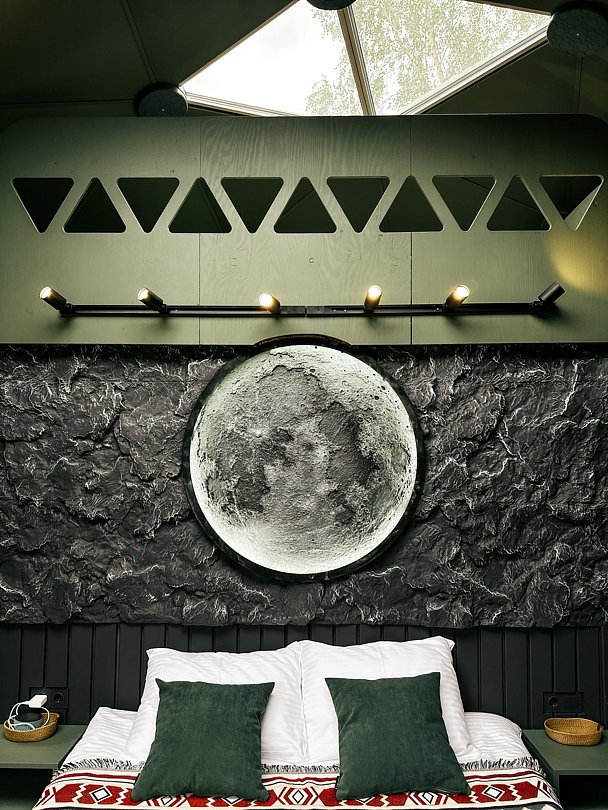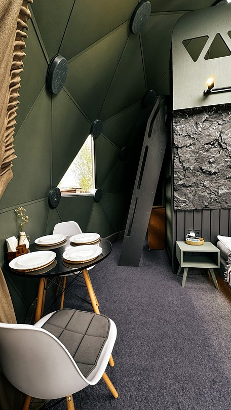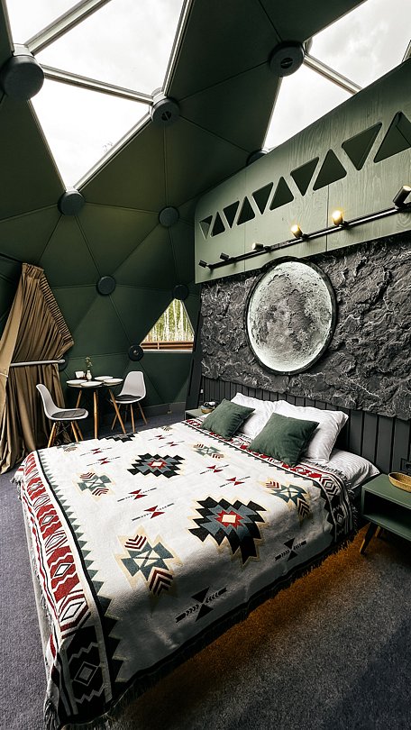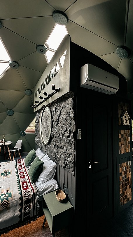 «Лунный Зеленый» купол с вместительностью до двух взрослых + два подростка. Стиль: современный. Площадь участка, соток: три. Площадь дома: 35 м². Размер кровати: 160х200, 140х200.