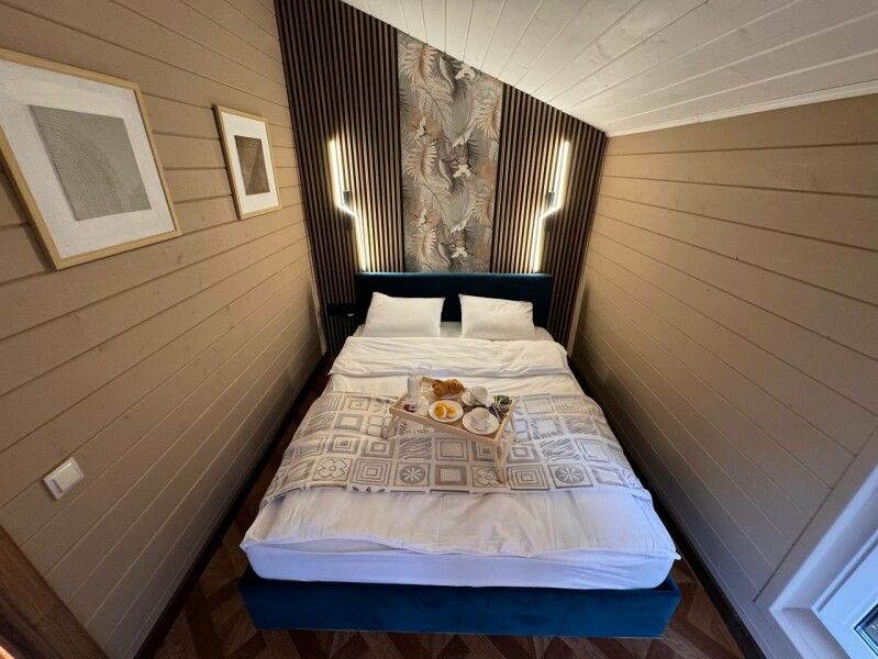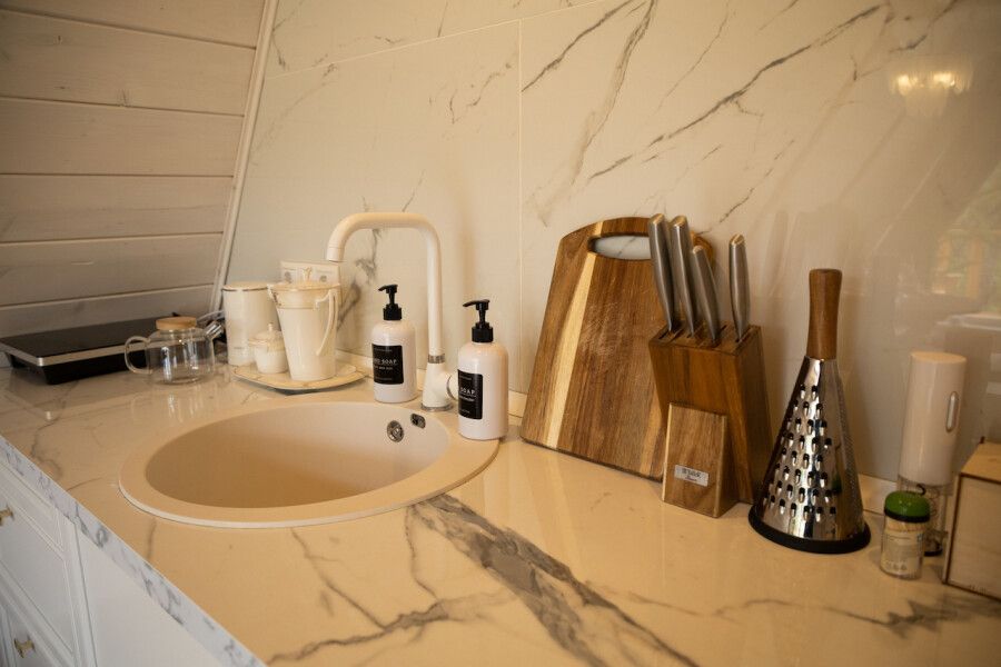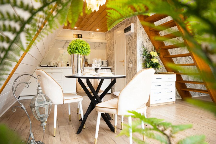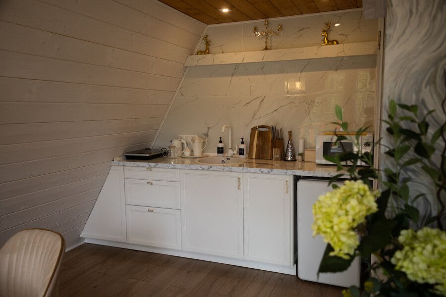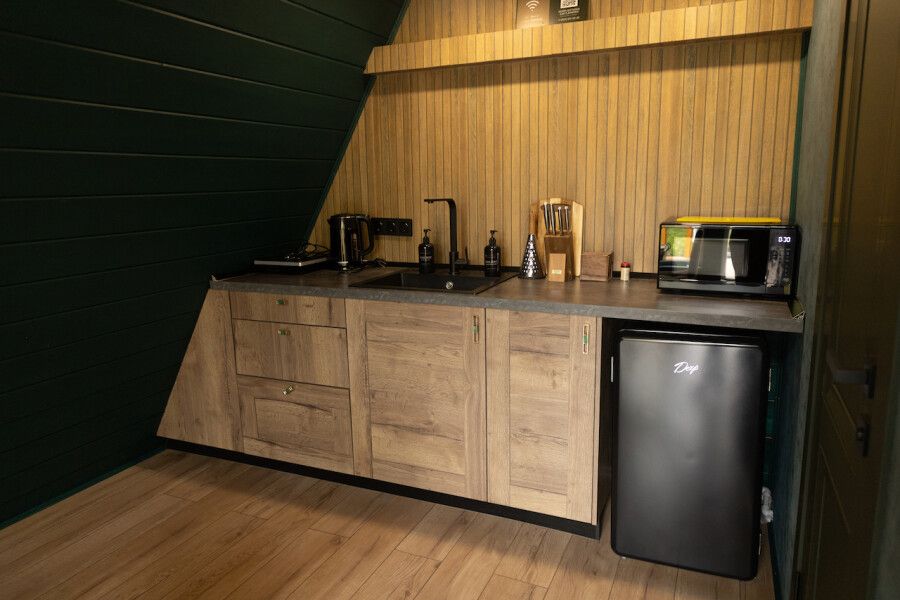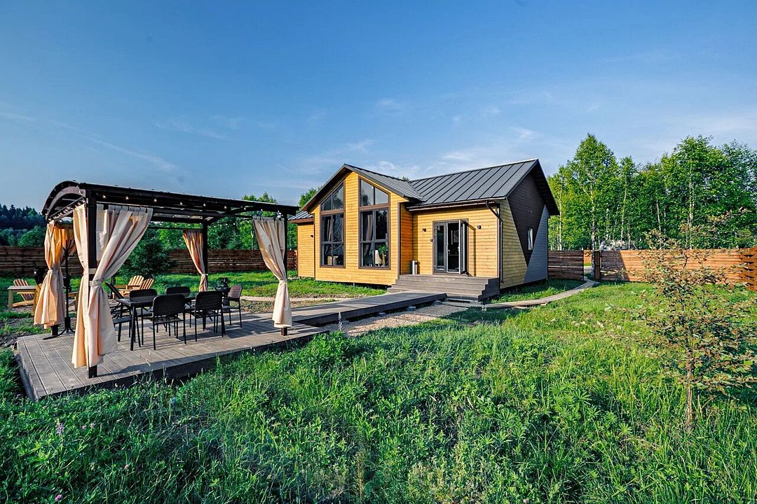 Внутри дома есть все необходимое для комфортного проживания: кухня, оборудованная всем необходимым, ванная комната с душевой кабиной и санузлом, обеденный стол и уютный диван, где всегда можно провести время за просмотром любимого фильма.