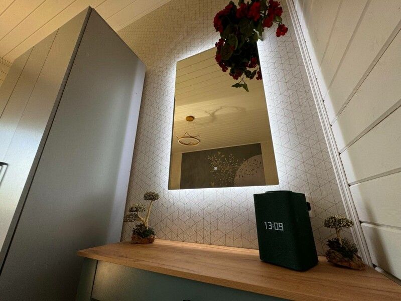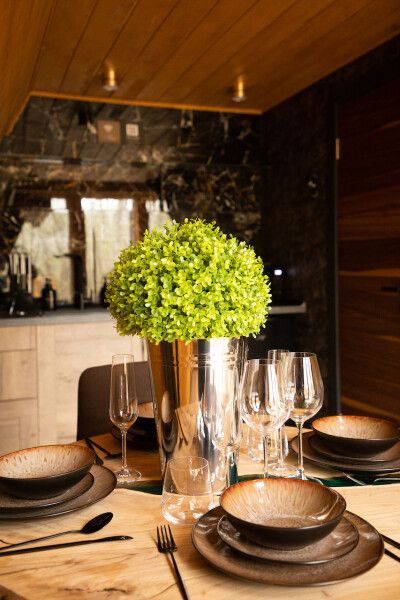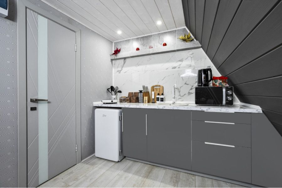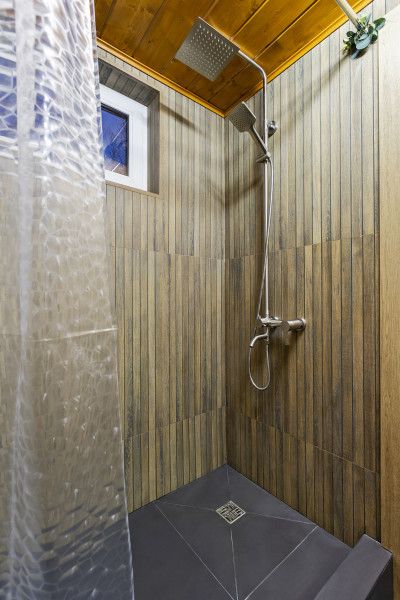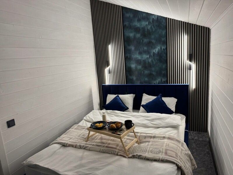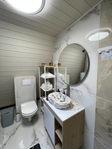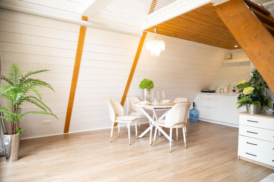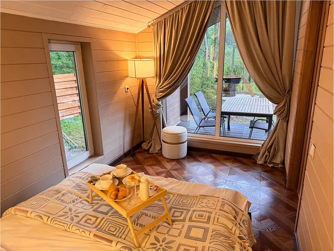 Внутри дома есть все необходимое для комфортного проживания: кухня, оборудованная всем необходимым, ванная комната с душевой кабиной и санузлом, обеденный стол и уютный диван, где всегда можно провести время за просмотром любимого фильма.