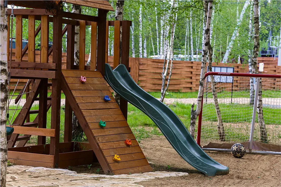 Детская площадка, где каждый ребенок будет увлечен: горки, качели, батут для весёлых прыжков, зона для детского футбола и баскетбола, а также бадминтон и боулинг.