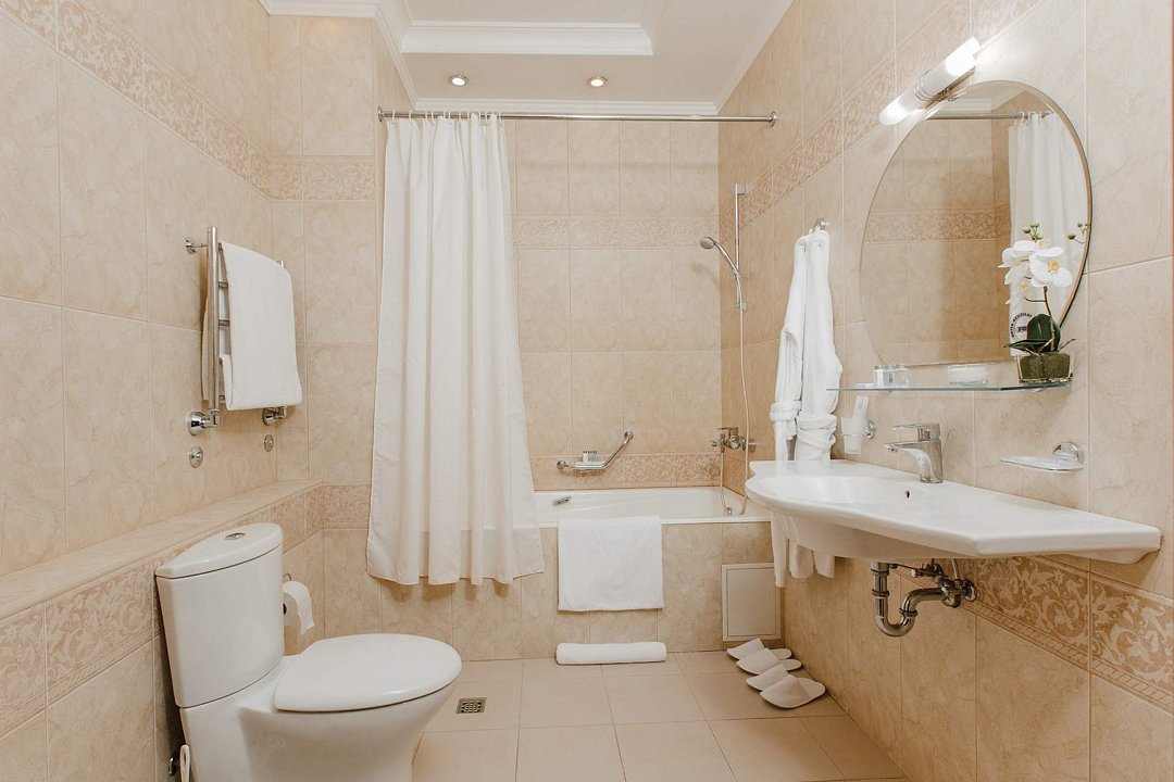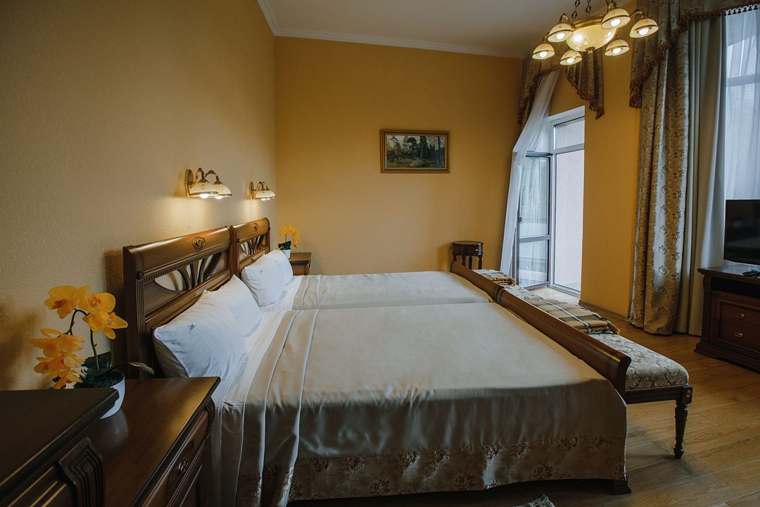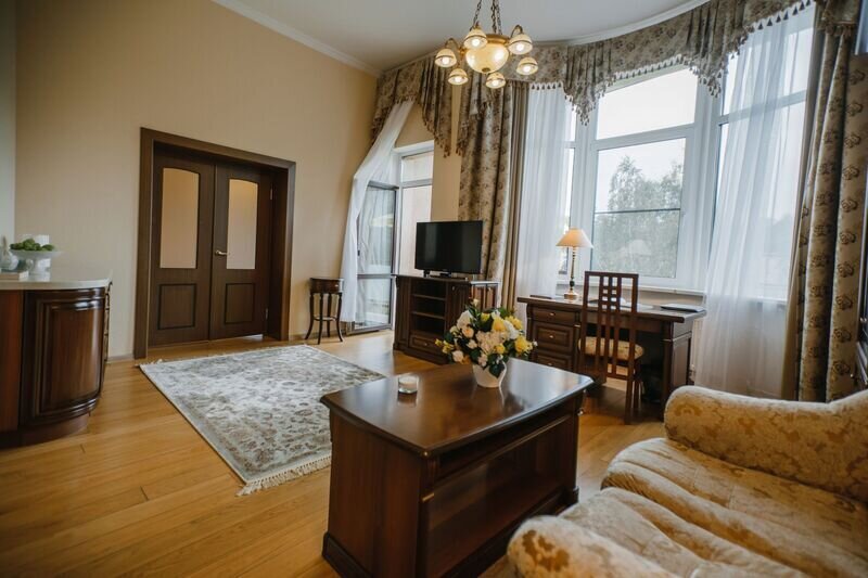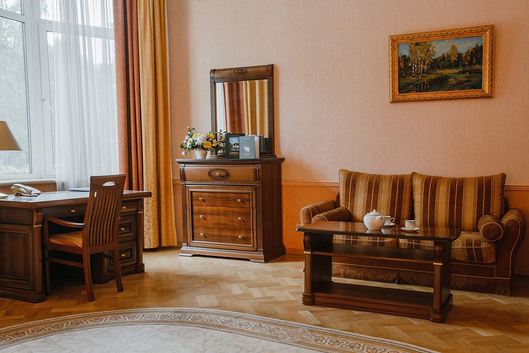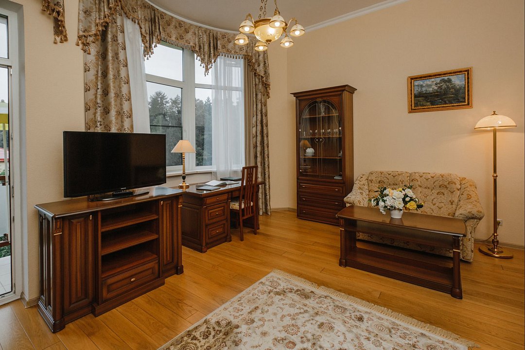 Санаторий занимает благоустроенную территорию площадью 80 гектаров и состоит из нескольких двух-, трех- и четырехэтажных жилых корпусов. Гостей ожидают комфортабельные номера категорий Люкс, Сьют, Улучшенный. Просторные номера, оформленные в классическом стиле, укомплектованы удобным мебельным гарнитуром, бытовой техникой – кондиционером, телевизором, холодильником, феном, в санузлах, в зависимости от выбранного категории – душевая кабина или ванная. В четырехкомнатном президентском номере имеется оборудованная кухня и рабочий кабинет.