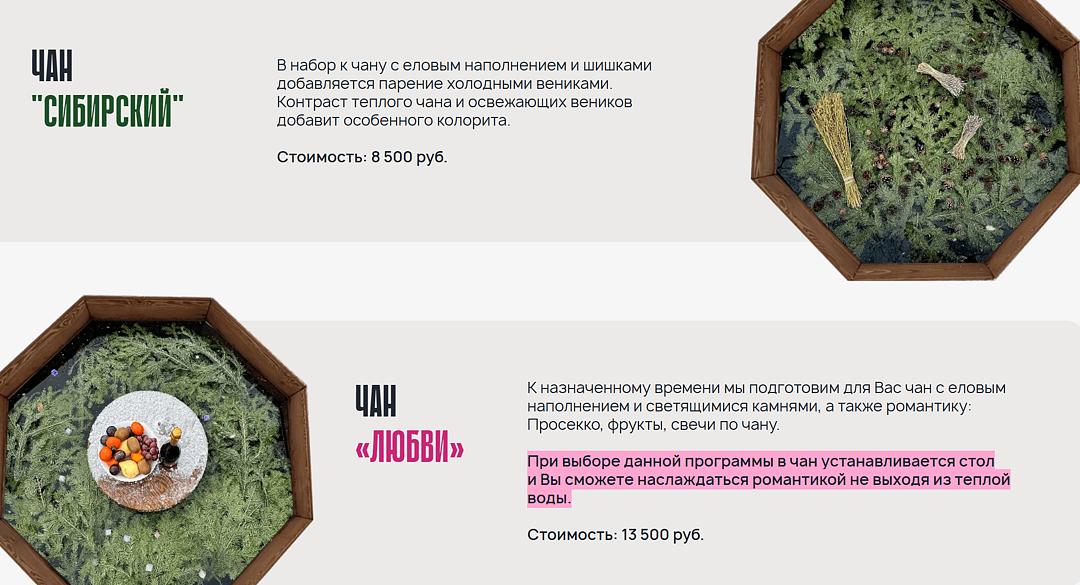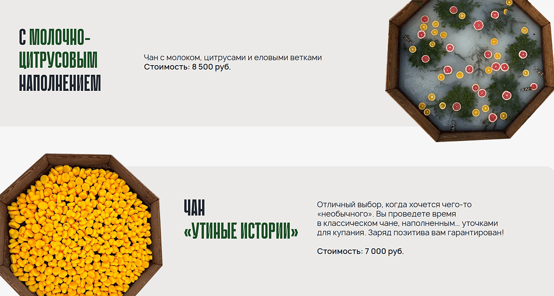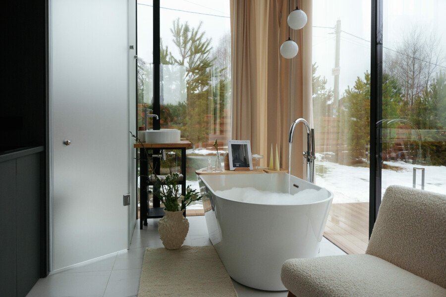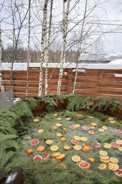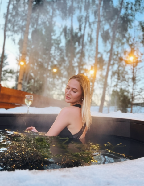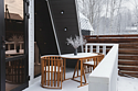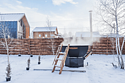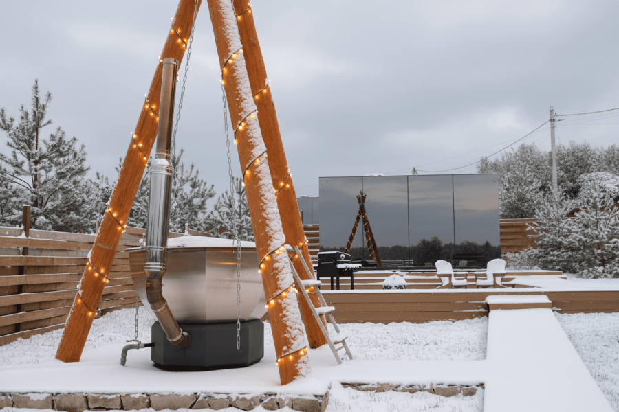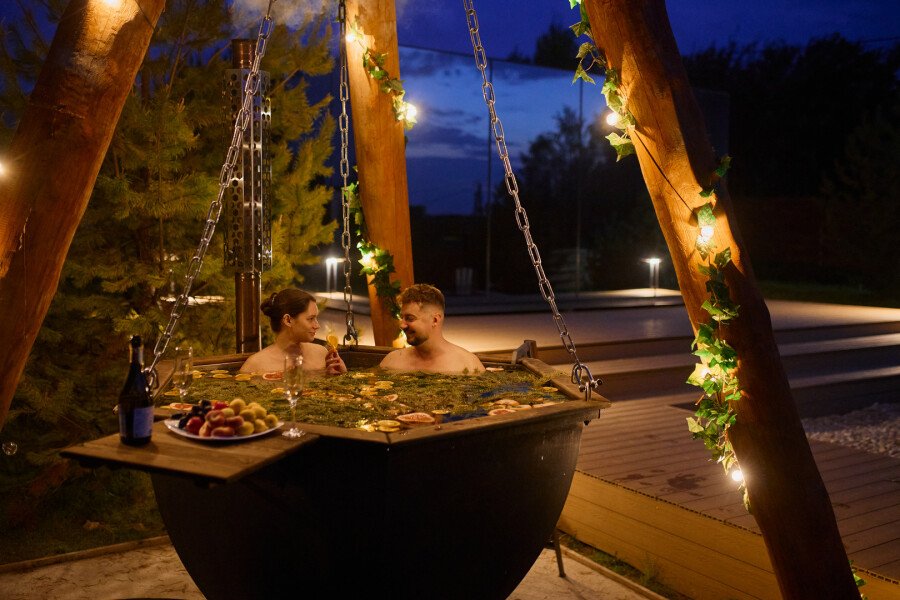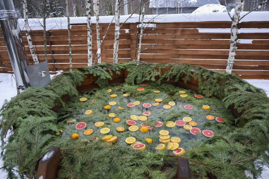 Рядом с каждым коттеджем, за исключением A‑FRAME BLACK, установлен уличный банный чан — уютное место для парения на свежем воздухе. Гостям предлагают как классический вариант парения, так и несколько специализированных программ, чтобы отдых стал еще более расслабляющим и атмосферным.