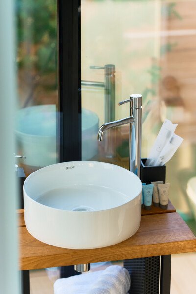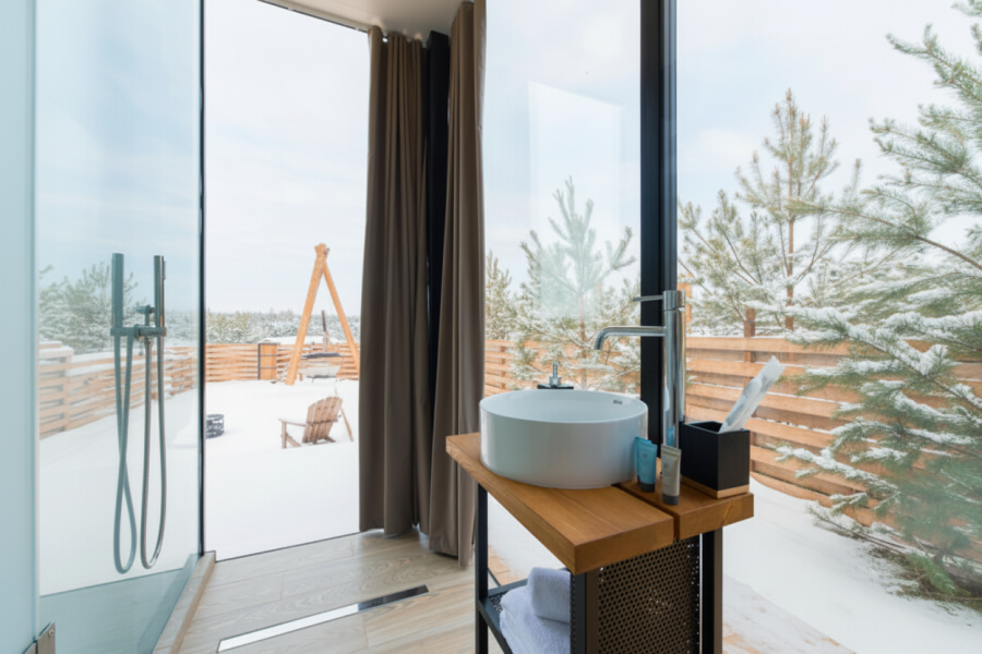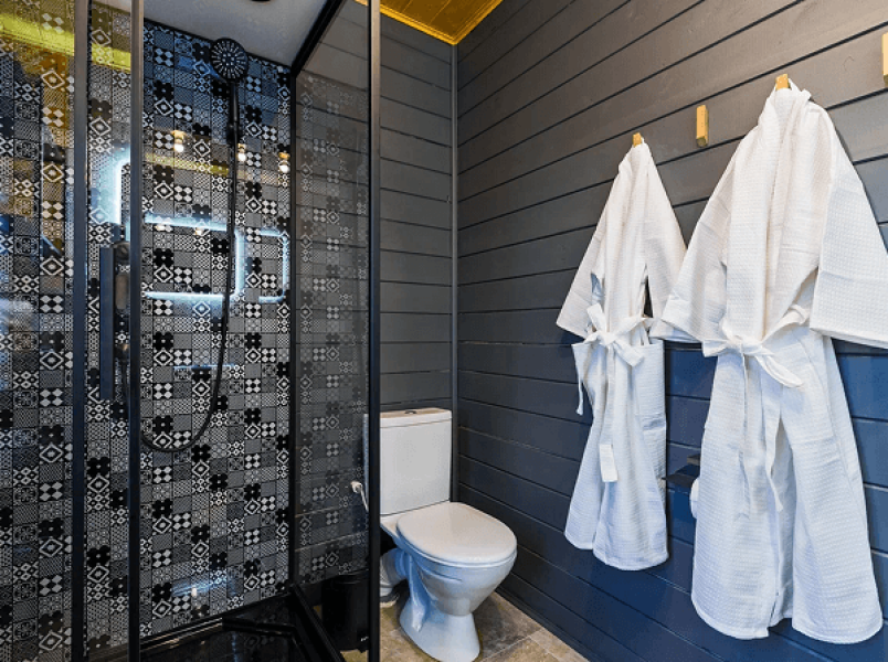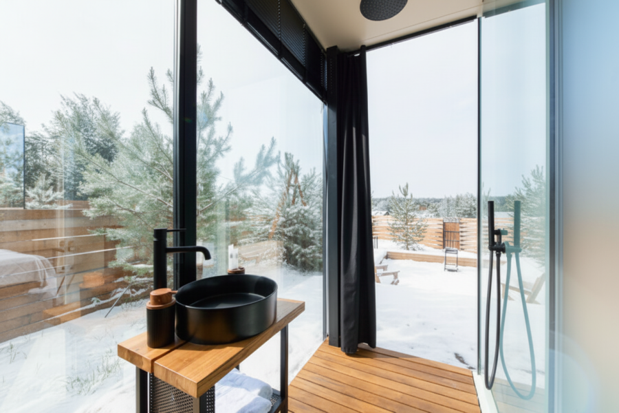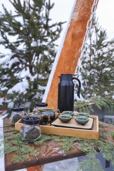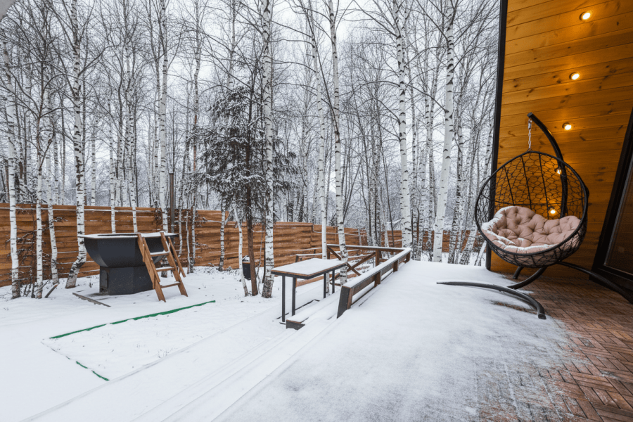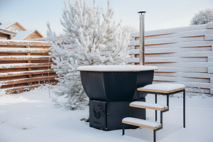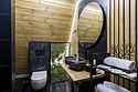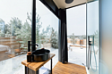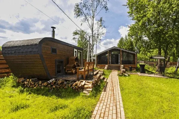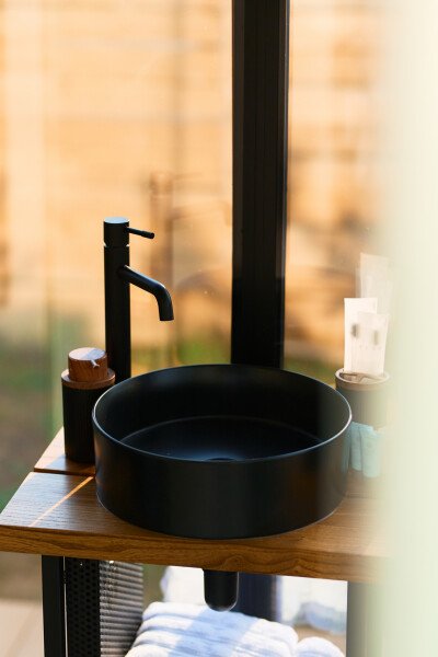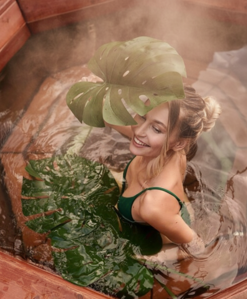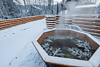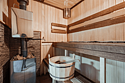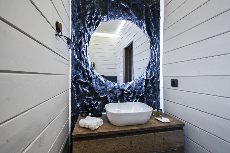 Рядом с каждым коттеджем, за исключением A‑FRAME BLACK, установлен уличный банный чан — уютное место для парения на свежем воздухе. Гостям предлагают как классический вариант парения, так и несколько специализированных программ, чтобы отдых стал еще более расслабляющим и атмосферным.