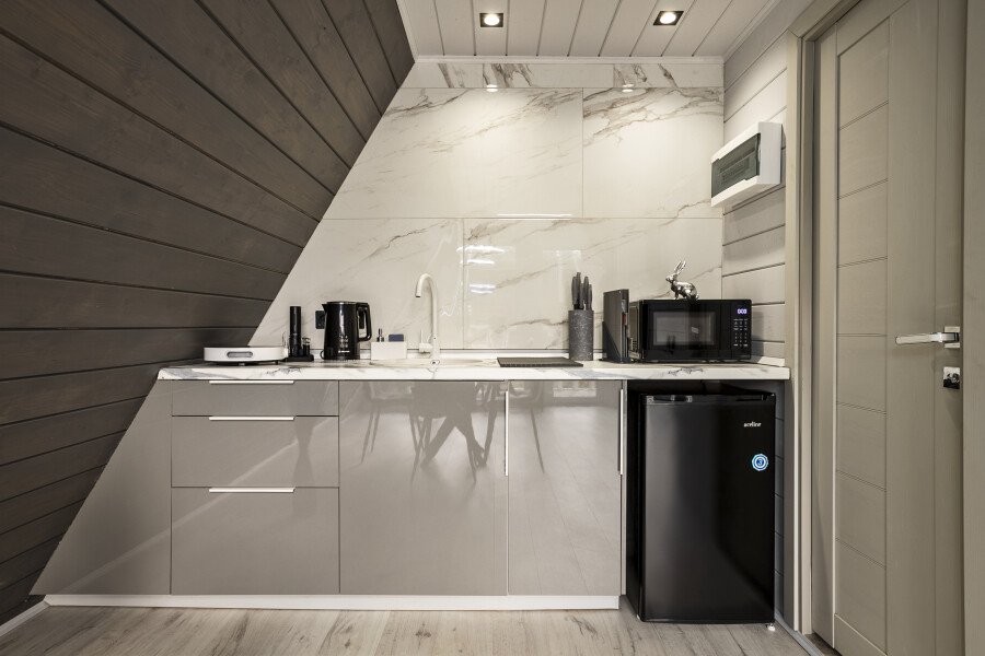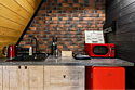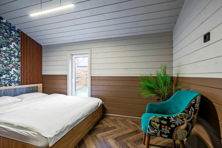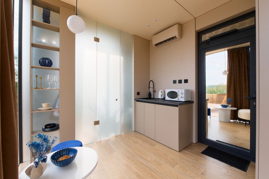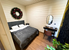 Оснащение номера и мебель: Площадь 20 кв.м. Кондиционирование/Система климат-контроля Теплый пол Светонепроницаемые шторы 2 кресла Журнальный столик Ванная комната: Собственный санузел Туалетно-косметические принадлежности Фен Кухня: Всё необходимое для приготовления еды Столовые приборы Чайник Электроника и развлечения: Проектор Колонка Алиса Вид: Вид на территорию дома