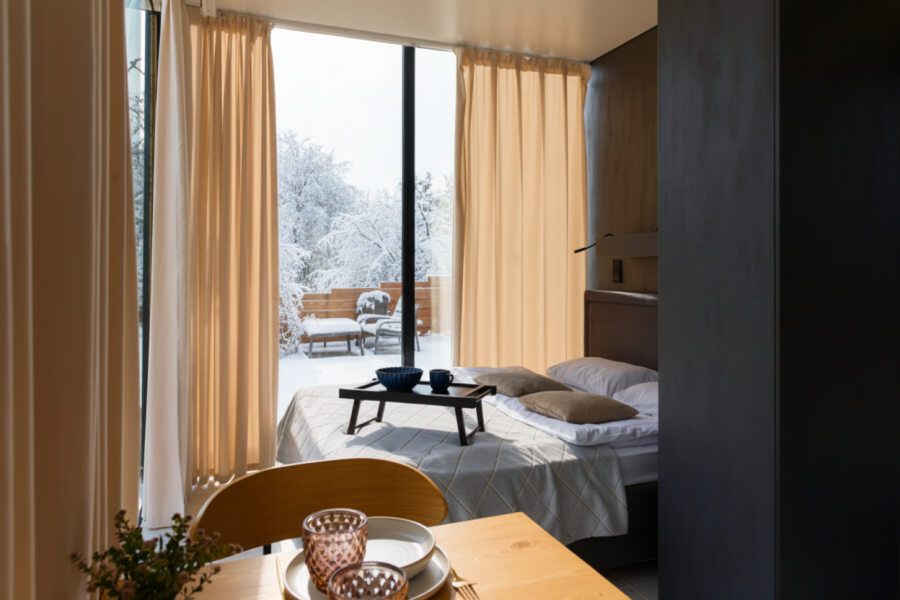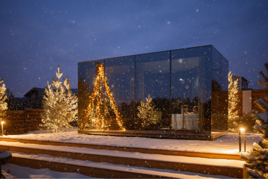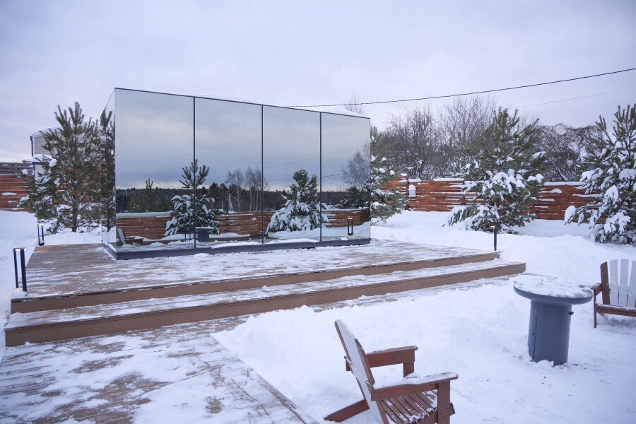 Зеркальный дом Baus 1 — идеальное место для уединения и романтического отдыха, где снежная тишина и волшебная новогодняя атмосфера создают сказочную обстановку для незабываемых моментов. Дом рассчитан на двух человек.