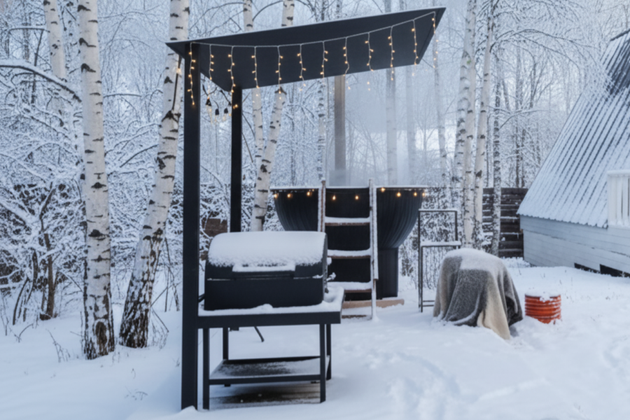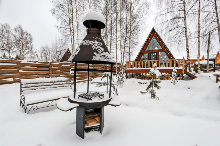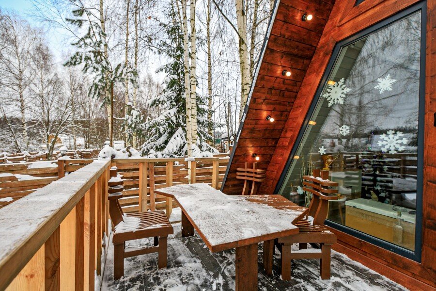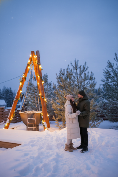 На территории вас ждет мангальная зона, где вы можете приготовить свои любимые горячие блюда, а вечером, под шум падающего снега, расслабиться в горячем чане с еловым наполнением, окутанном ароматами зимнего леса и праздничной магии.