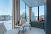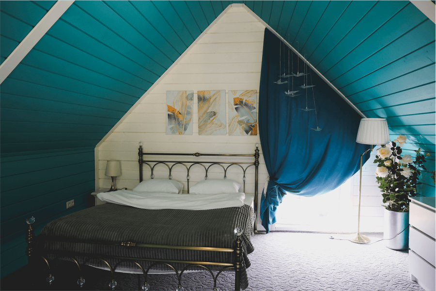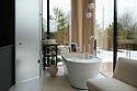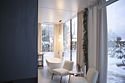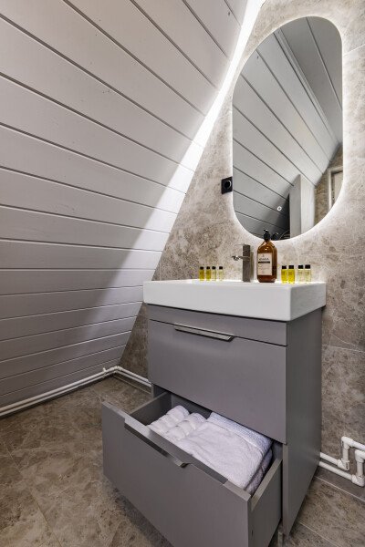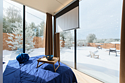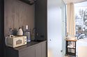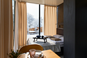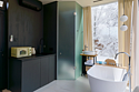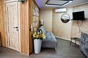 Площадь двадцать квадратных метров. Оснащение номера и мебель: кондиционирование/система климат-контроля, теплый пол, светонепроницаемые шторы, два кресла, журнальный столик, собственный санузел, туалетно-косметические принадлежности, душ, фен, ванна, все необходимое для приготовления еды, столовые приборы, чайник, проектор, колонка «Алиса», вид на территорию дома.