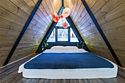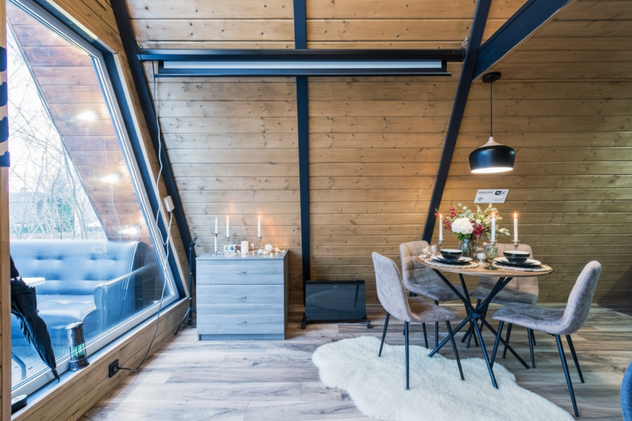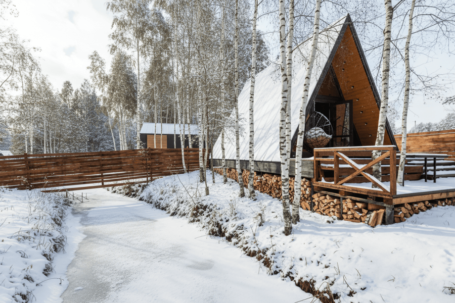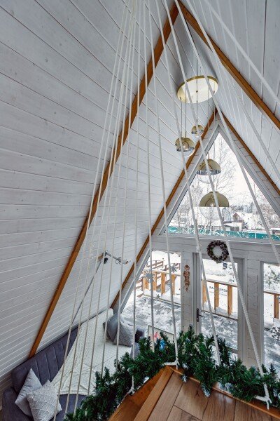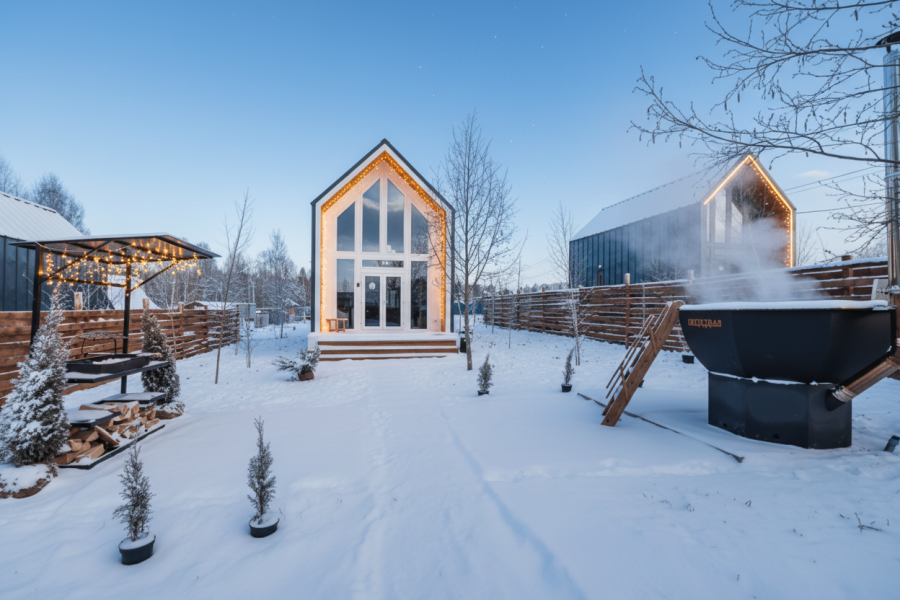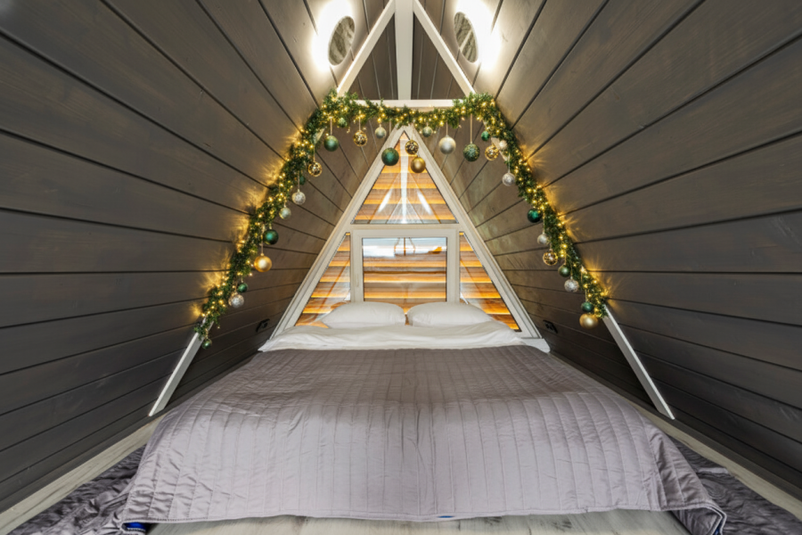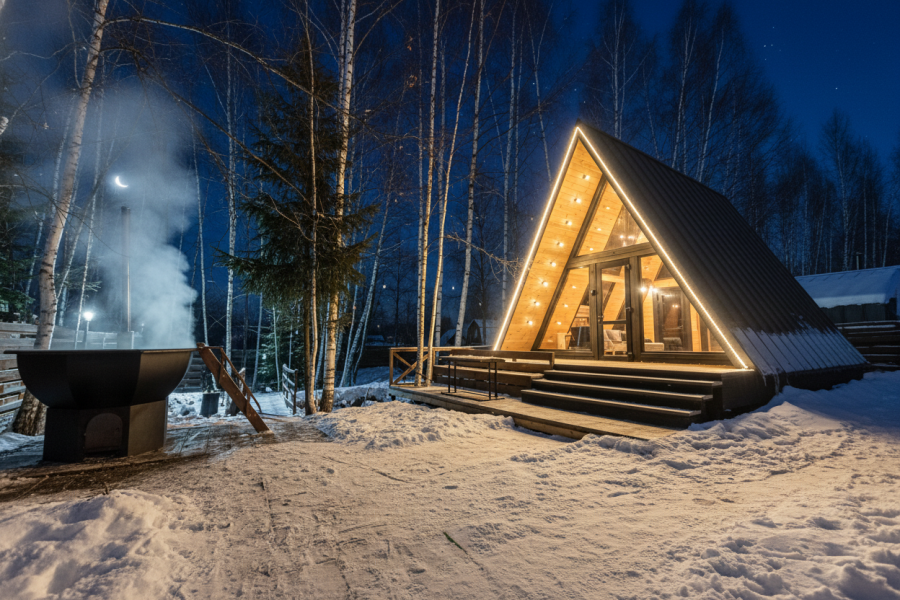 A-Frame NEO — уютный дом в холодных тонах, но с теплой душой и горячим чаном, идеально подходящий для зимних праздников. Представьте, как под сияющими огнями и снежной вуалью вы расслабляетесь в горячей воде, окружённые волшебством новогодней ночи, и чувствуете тепло и уют в сердце в этом сказочном зимнем уголке.