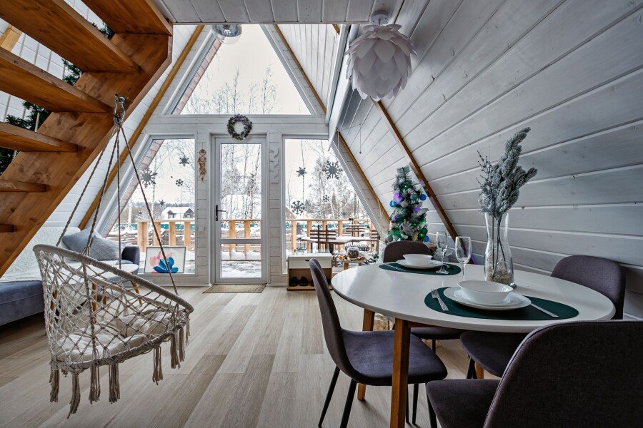 A-Frame White идеально подходит для отдыха, проведения девичников и романтических вечеров в зимней сказке. Белоснежный дом создает атмосферу праздника и уюта, а вокруг — мерцающий снег и зимняя природа.
