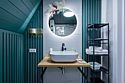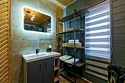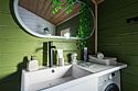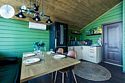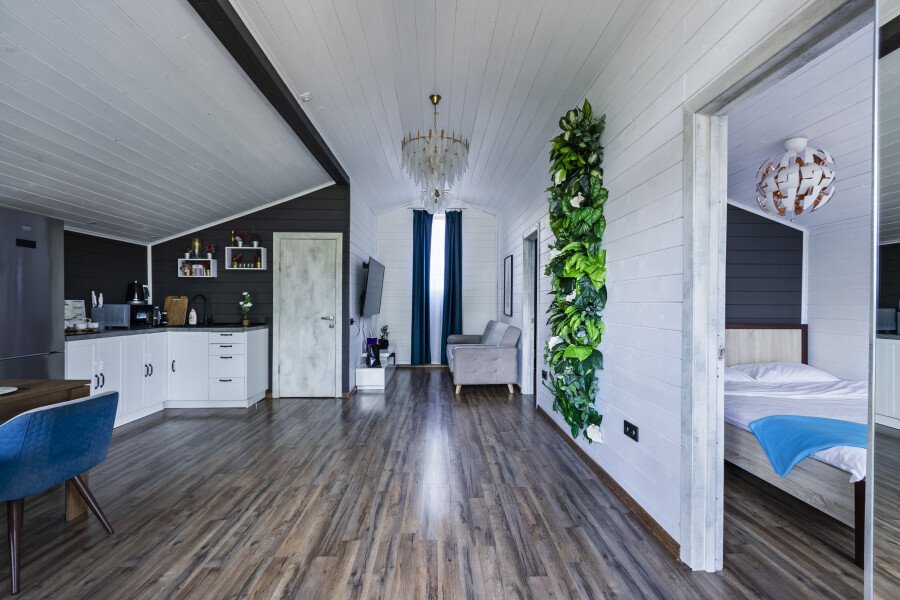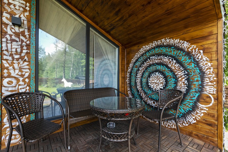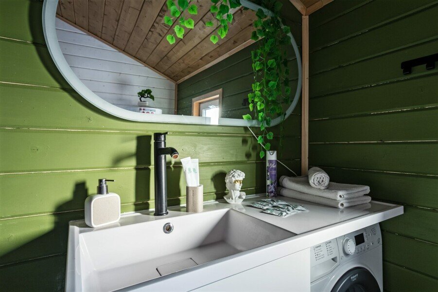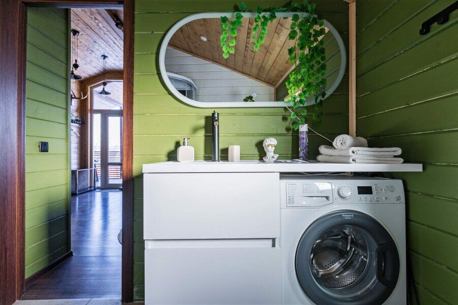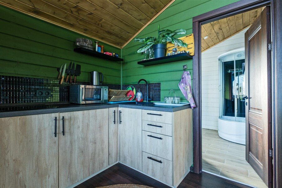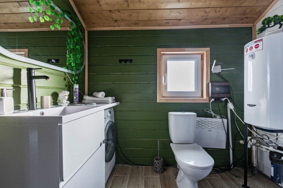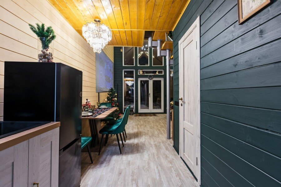 В зале ваш отдых дополнят телевизор и большая умная колонка «Алиса», а диван-кровать предложит место для гостей. Зеленый дизайн дома создаёт атмосферу спокойствия и воссоединения с природой, а теплый пар от горячего чана на территории подарит незабываемые моменты уюта и радости.