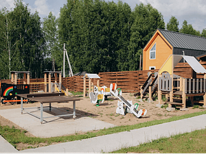 На базе расположена детская площадка с настоящим синим трактором, который привлекает внимание детей. Малыши с радостью проводят время, играя и делая фотографии с персонажем из любимого мультфильма.