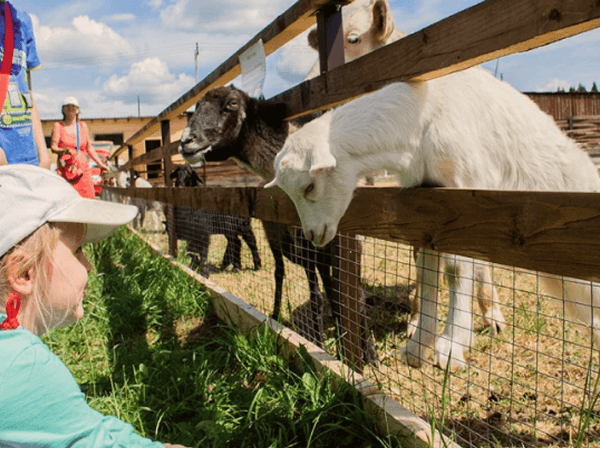 Для семей с детьми здесь приготовлено настоящее приключение: мини‑ферма, где можно погладить козлят и кроликов, увидеть быков и свиней, а также детская площадка с синим трактором и фотозонами с любимыми персонажами. Маленьким гостям понравятся прогулки на пони, а для любителей тишины и рыбалки — спокойный пруд в шаговой доступности.
