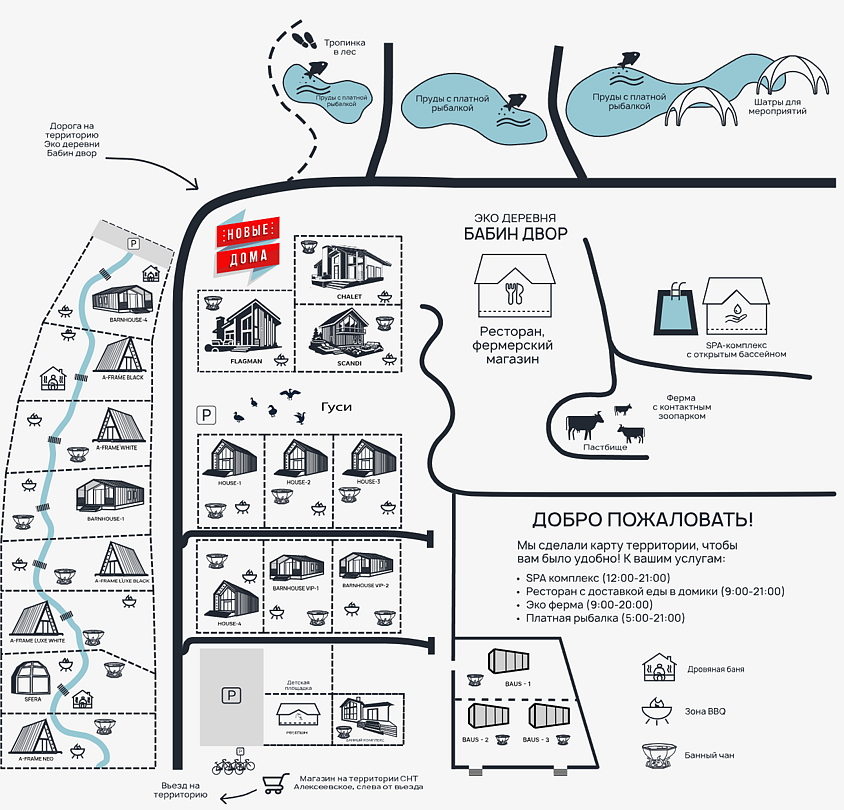 - House-1,2,3 и 4, Barnhouse-1,2,3 и 4, Barnhouse VIP-1, Barnhouse VIP-2, Sfera — заезд с 16:00, выезд до 13:00.
