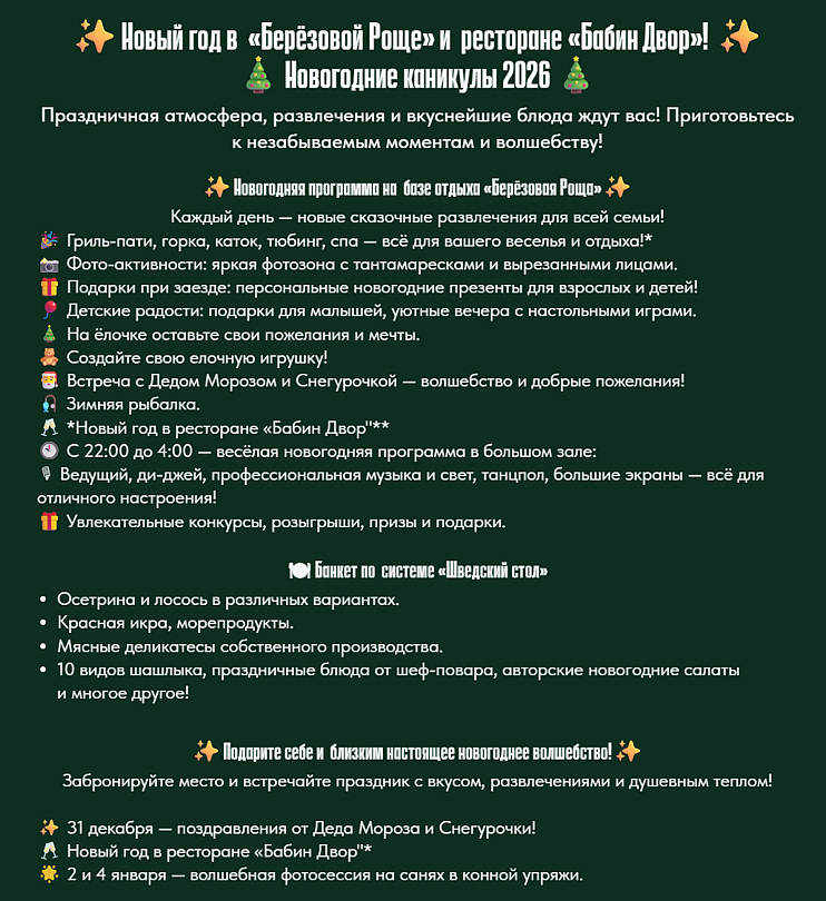 Для гостей базы «Березовая роща» в ресторане «Бабин двор» сервируют сытный и ароматный завтрак по системе шведского стола. Уютная обстановка и внимательное обслуживание создают бодрое и приятное начало дня для каждого гостя.
