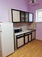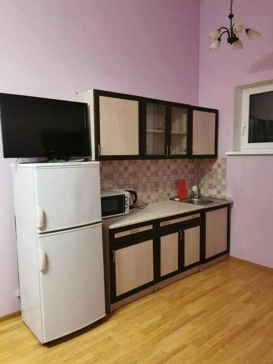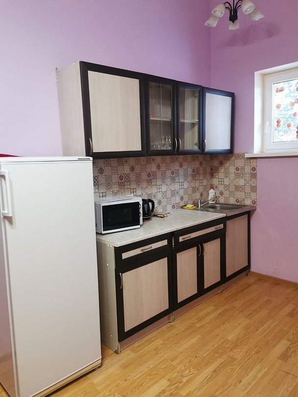 Гостиная: Кухонный гарнитур без плиты, обеденный стол, холодильник, чайник, микроволновая печь, диван, минимальный набор посуды.