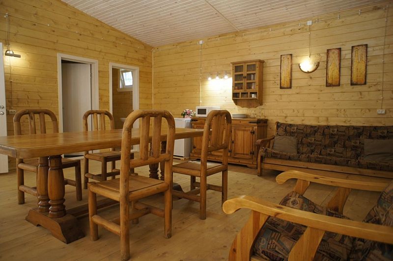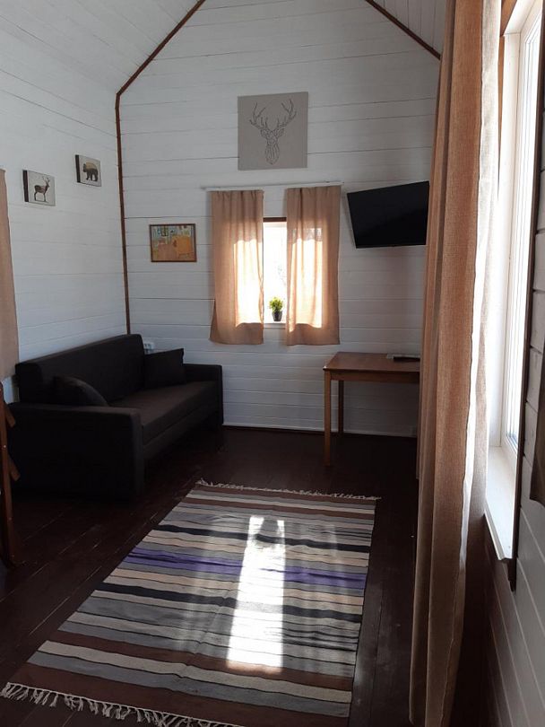 Гостиная-36 м2 (диван раскладной, стол, 4 стула, телевизор, холодильник, свч печь, посуда). Спальня – 12 м2 (двуспальная кровать, тумбочка, шкаф, торшер). Туалет + душевая кабина. Открытая веранда - 18 м2.