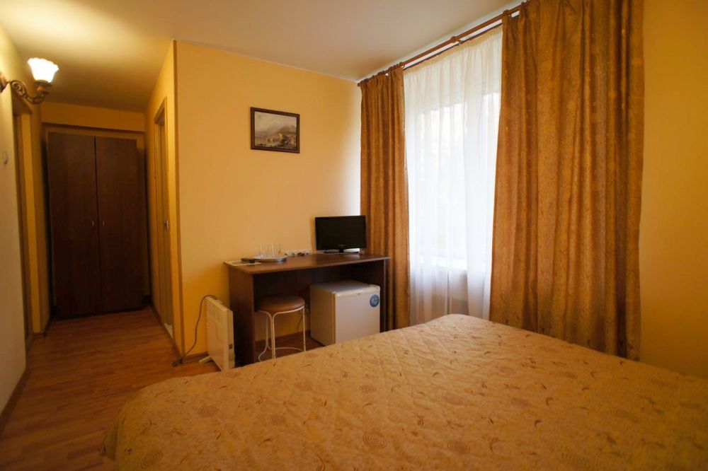В номере: шкаф, тумбочка, телевизор, 2 двуспальные кровати, диван, 2 кресла, туалет, душевая кабина.