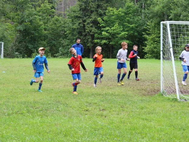 Футбольное поле размером 60*35 с травяным покрытием. Мяч для игры можно взять в аренду на ресепшен или привезти с собой.