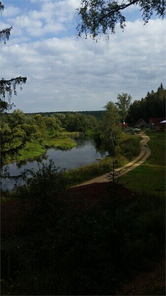 2-х этажный деревянный коттедж находится на небольшом холме, окруженном лесом, с которого открывается прекрасный вид на реку, лес и окружающие поля.