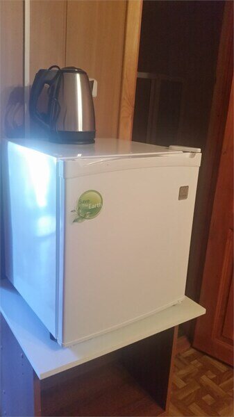 Двухкомнатный номер на троих с большой двуспальной кроватью и полутороспальным местом. Подойдет для размещения семьи. Уютный кухонный уголок с СВЧ, холодильником, чайником и чайным набором.