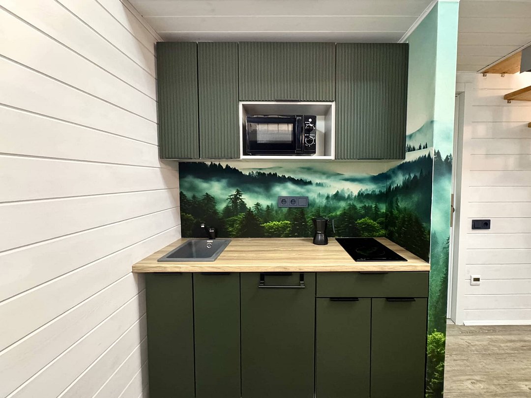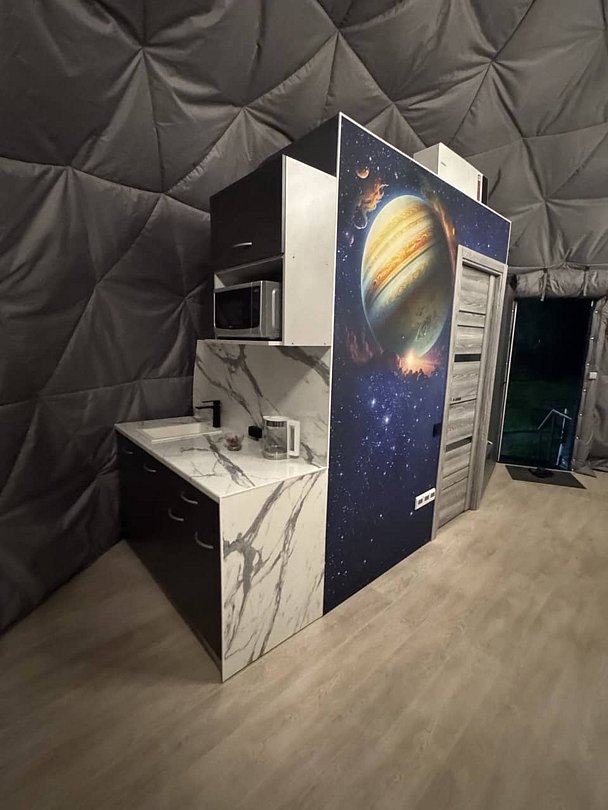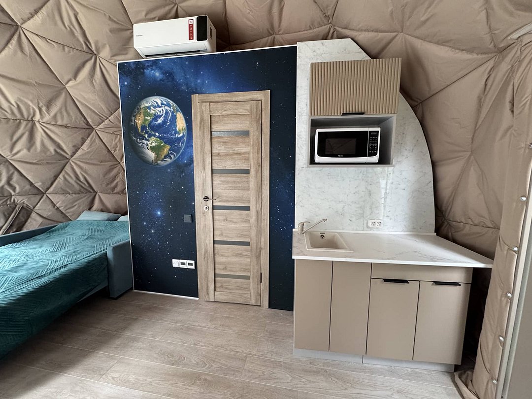 В каждом доме есть кухня с микроволновой печью, в домах есть двухконфорочная плита, в сферах одноконфорочная плита предоставляется бесплатно по запросу.