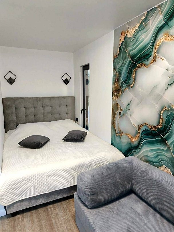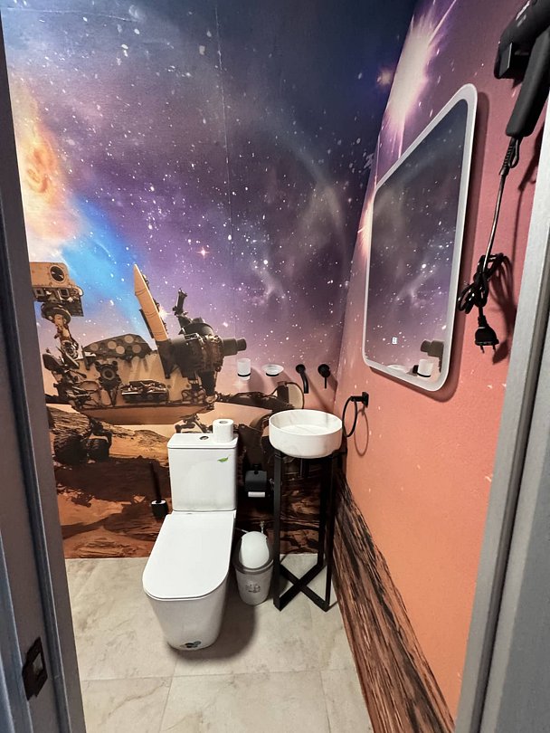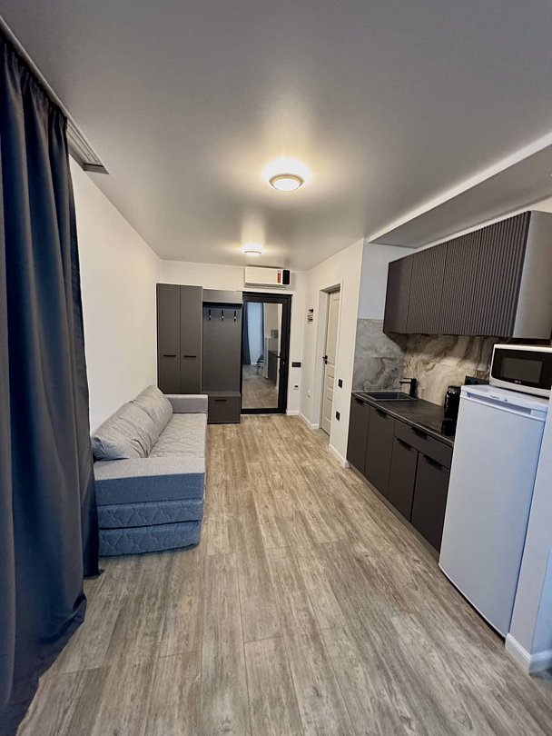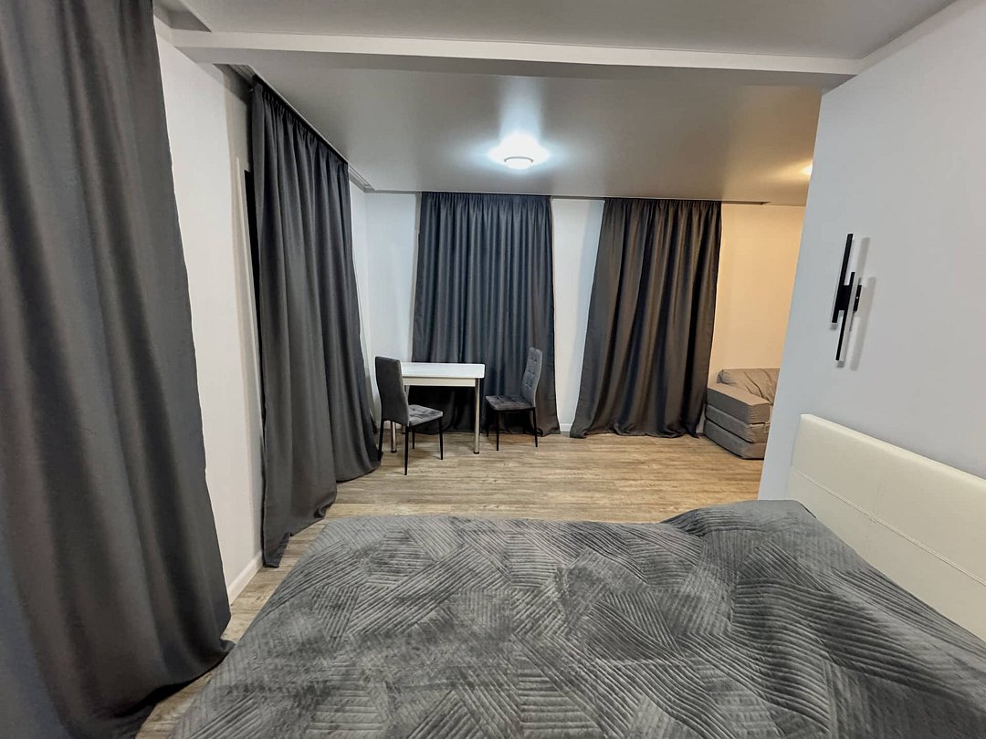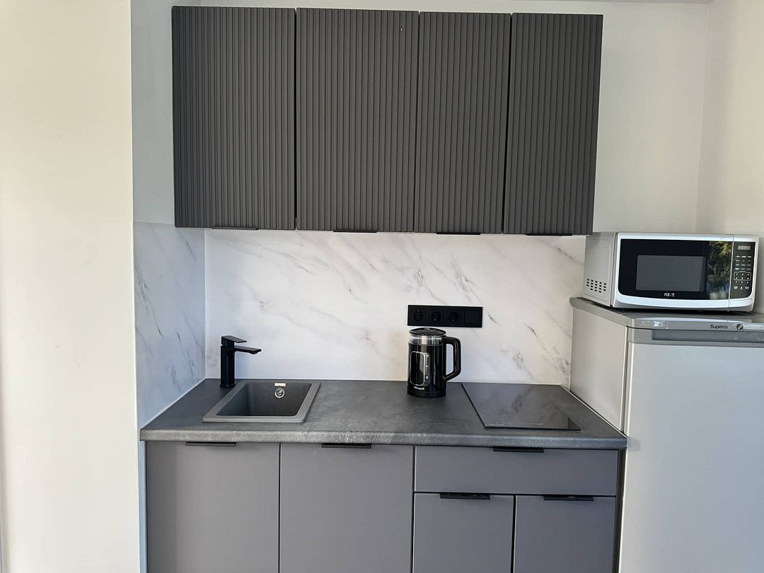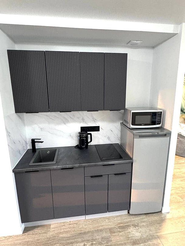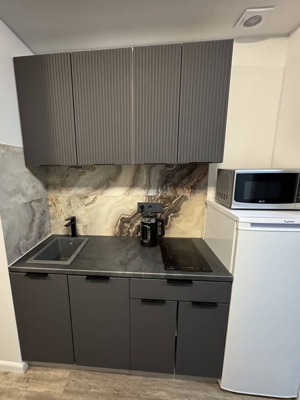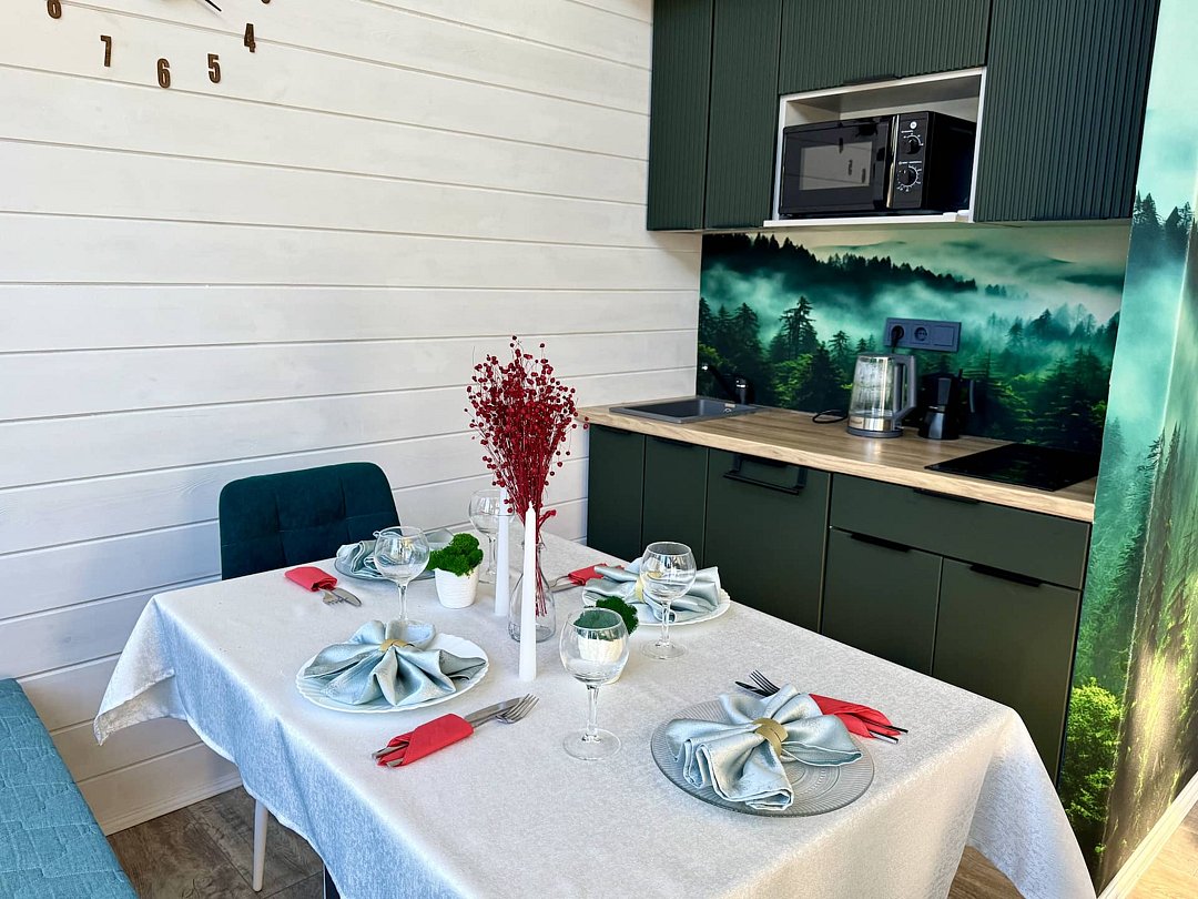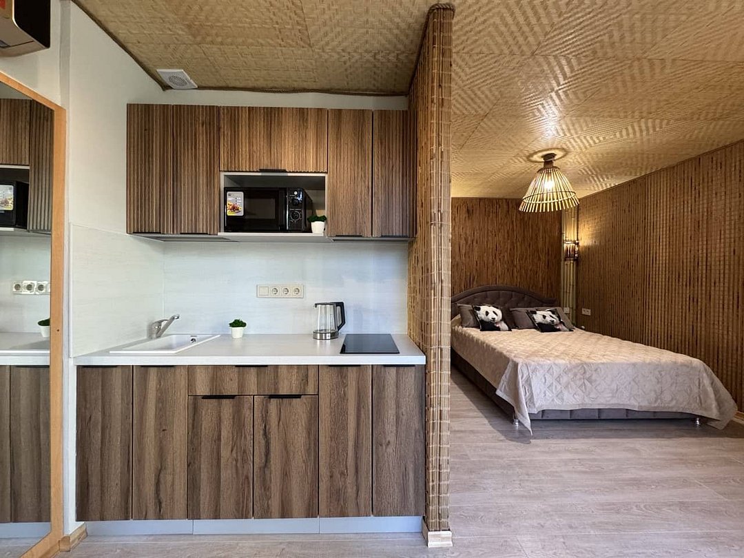 Каждый вариант размещения оснащен всем необходимым: здесь есть беспроводной интернет, телевизор, современная система климат-контроля и теплые полы. Продуманный интерьер включает светонепроницаемые шторы для крепкого сна, качественные кровати с ортопедическими матрасами. Кухонная зона полностью оборудована для приготовления еды — от микроволновой печи и холодильника до полного набора столовых приборов и посуды. Для вашего удобства предусмотрены обеденный стол, чайник, а также чай и кофе.