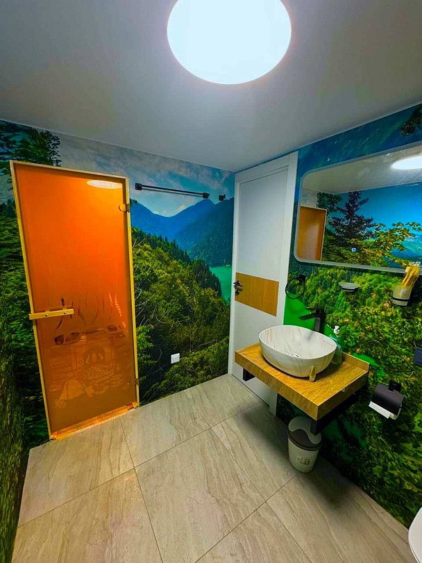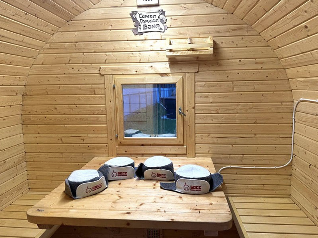Некоторые дома имеют собственную сауну, а на территории комплекса гостей ждут две классические русские бани и пять горячих чанов для настоящего релакса. Пространство для отдыха на свежем воздухе включает открытую террасу, зону барбекю и уютную крытую беседку. Для развлечений доступны портативная колонка с караоке, разнообразные настольные игры, батут, романтические качели-кокон для двоих, удобные шезлонги и костровая чаша для вечерних посиделок у огня.