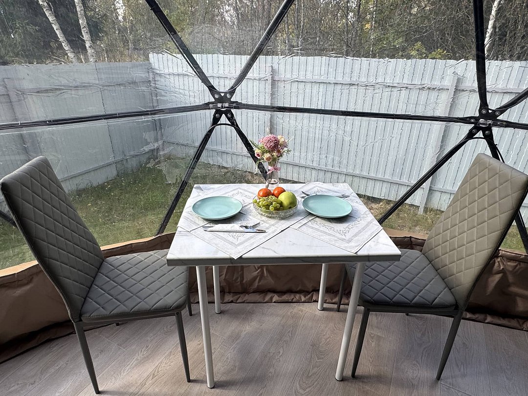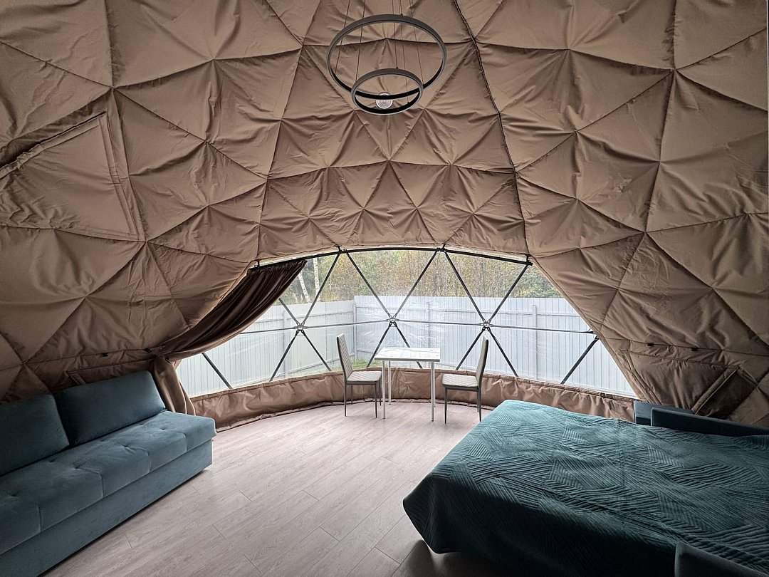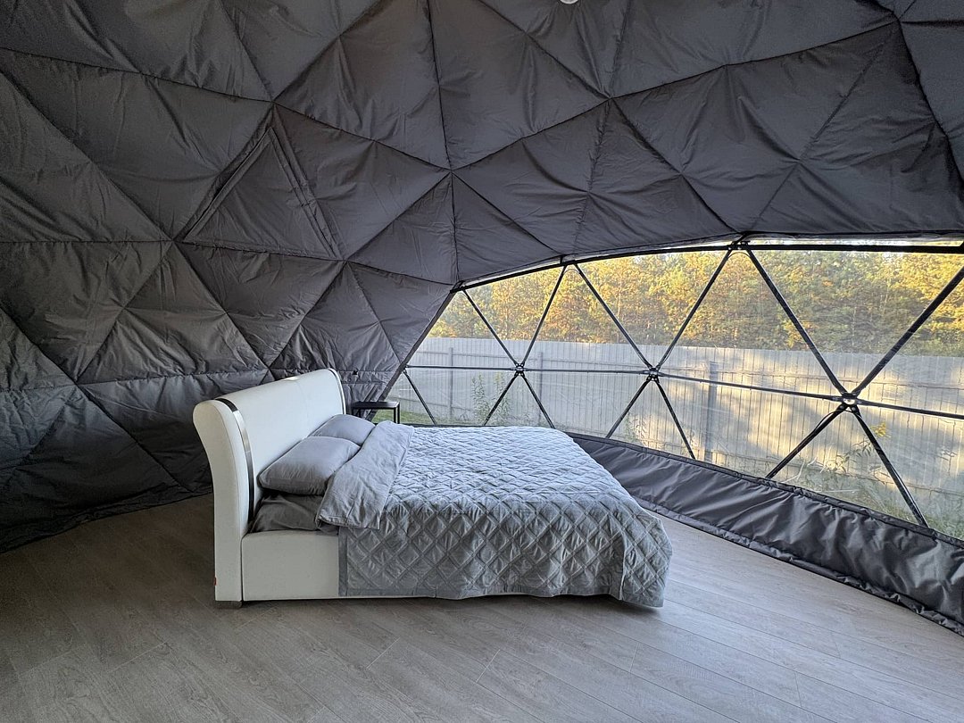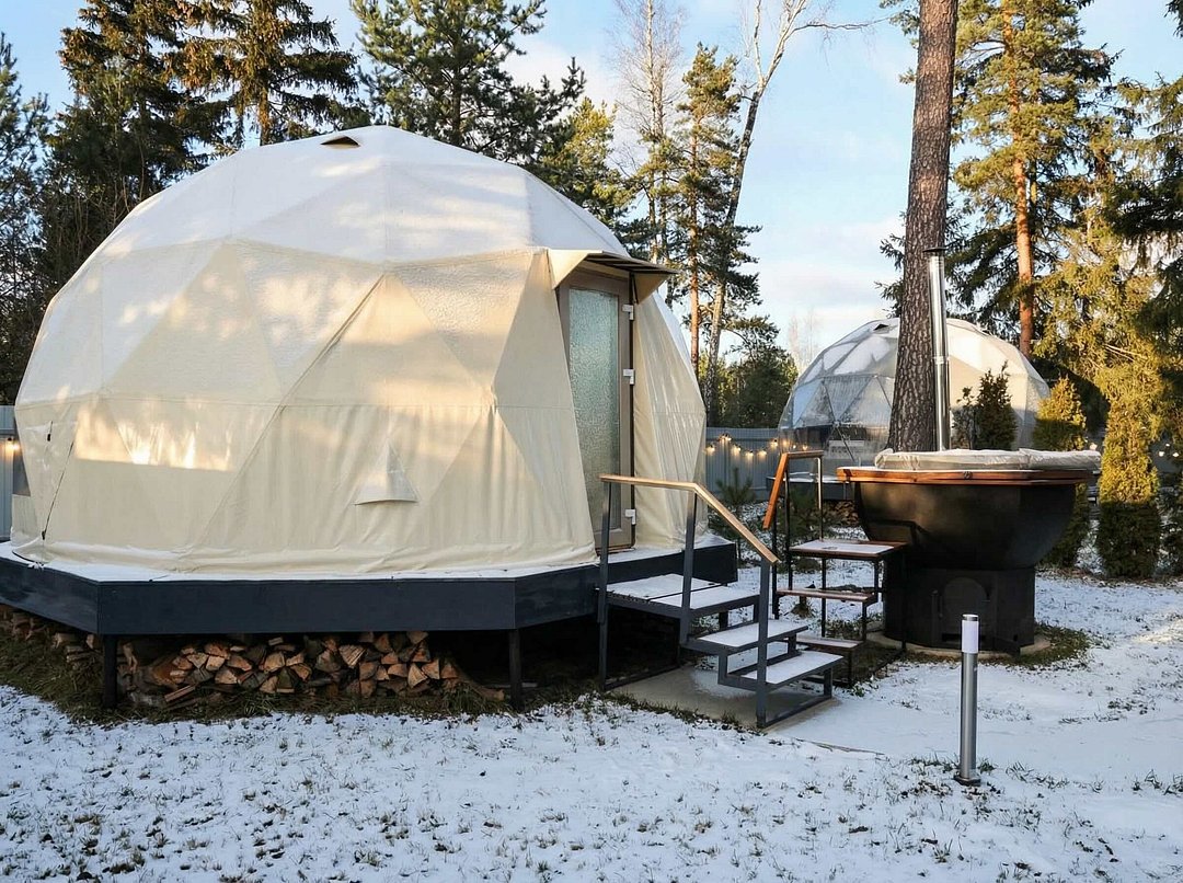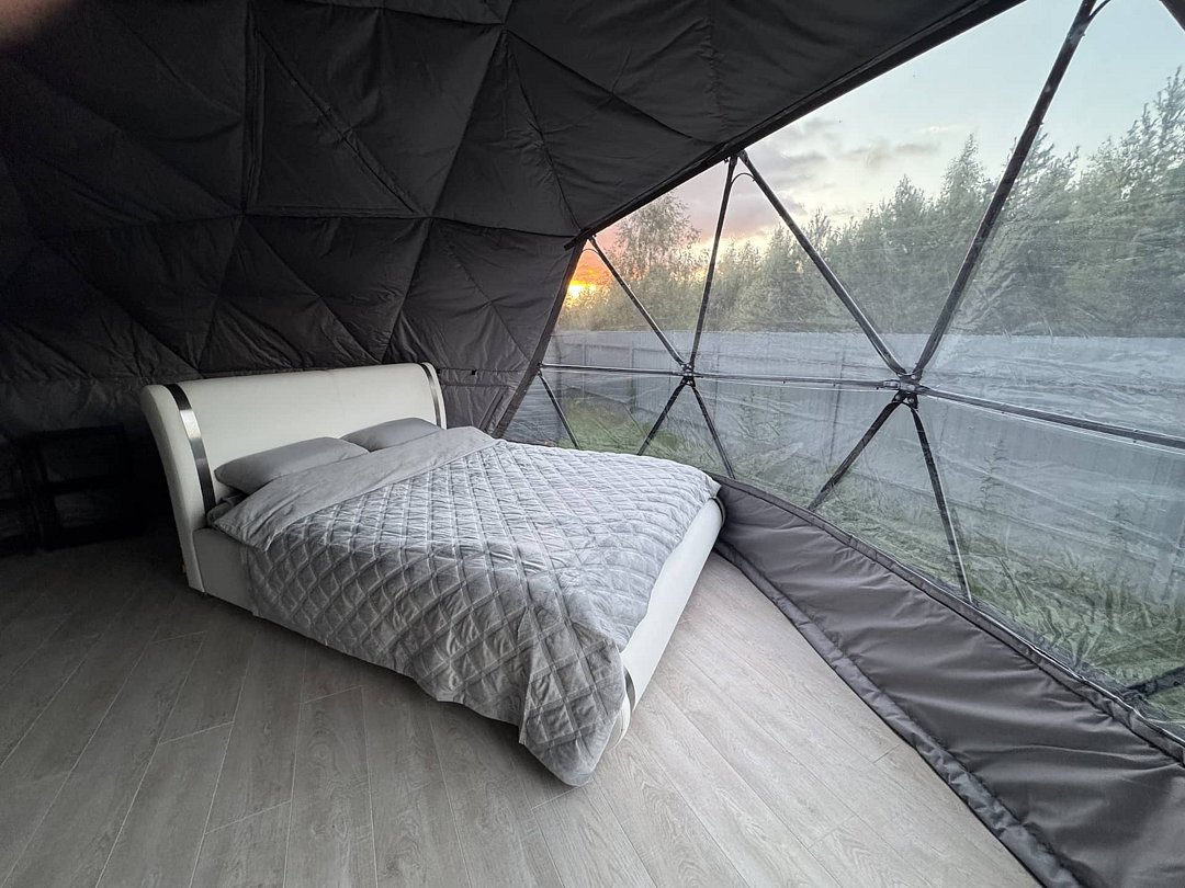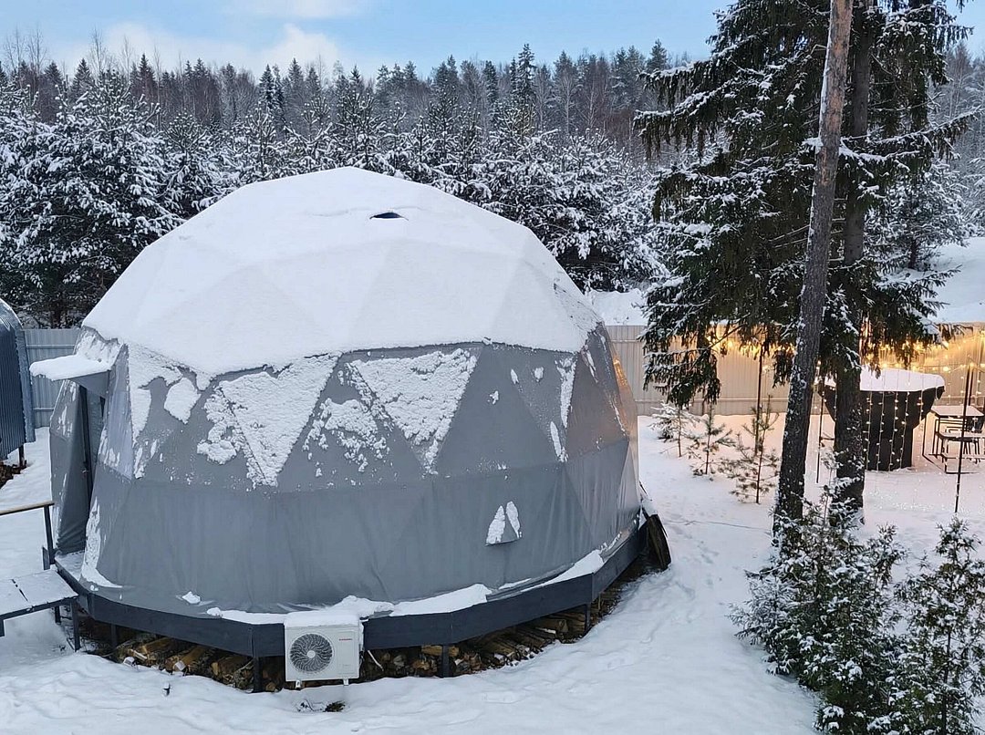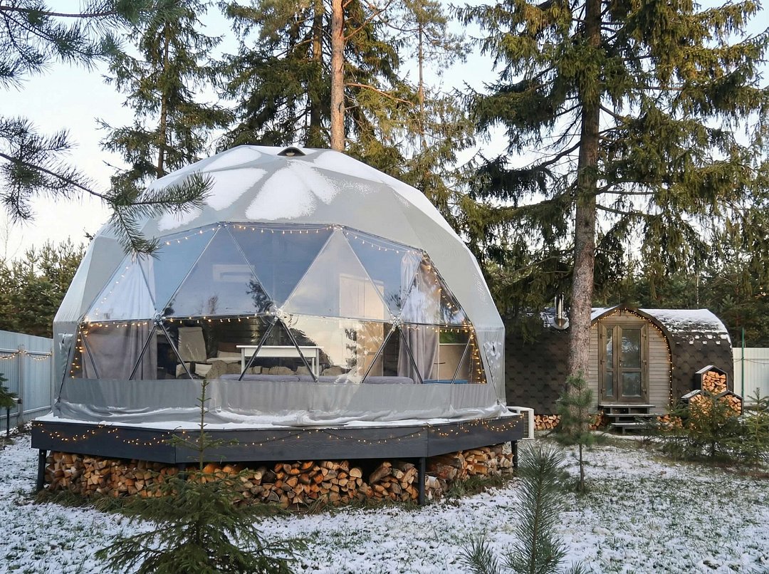 Стильный купольный домик с панорамным видом на звёздное небо. Идеален для романтического отдыха и созерцания природы в уединении.