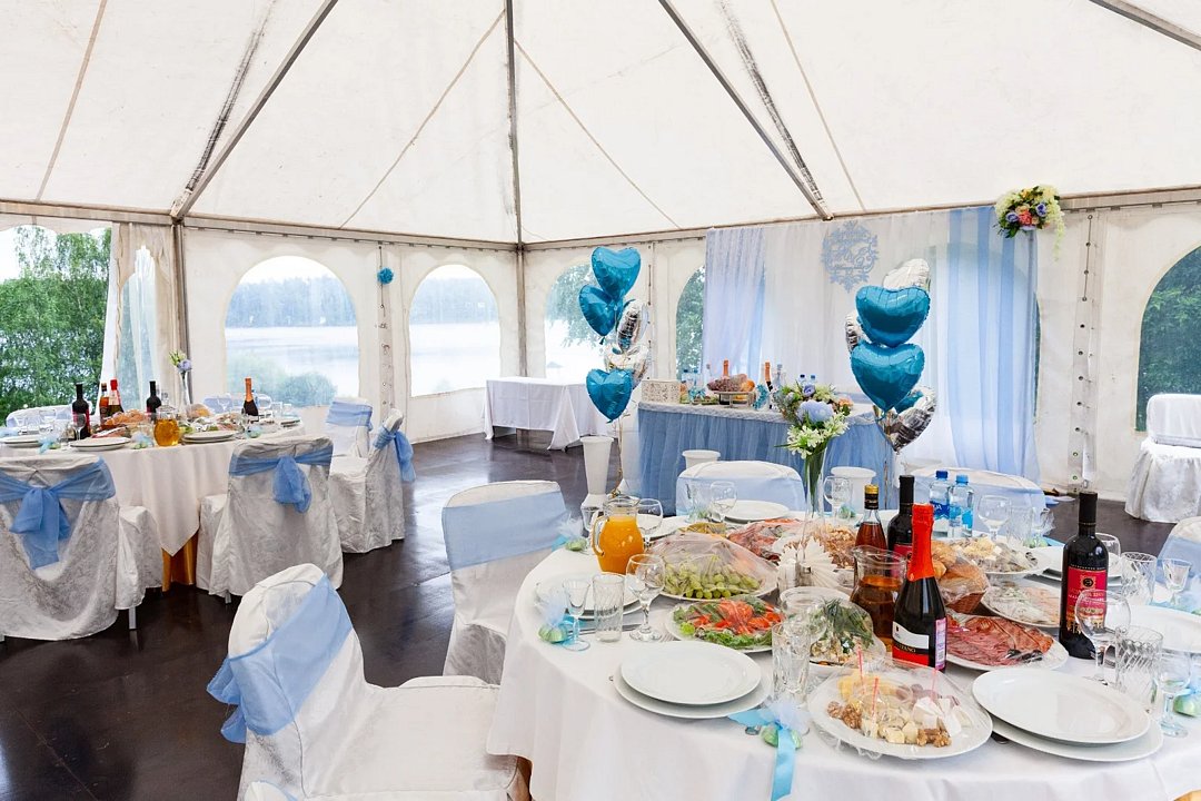 Шатер, раскинувшийся на берегу Озернинского водохранилища, превращает каждое событие в праздник, который навсегда остается в памяти. Его просторная площадь в 300 м² позволяет комфортно разместить до 200 гостей на банкете или от 130 до 150 на фуршете.