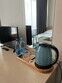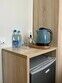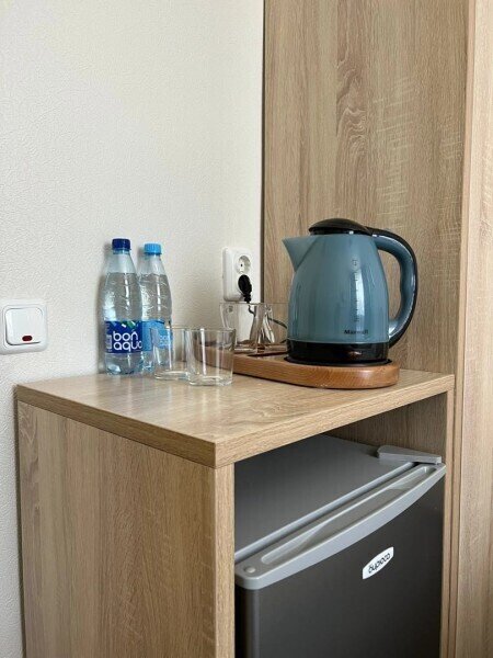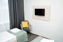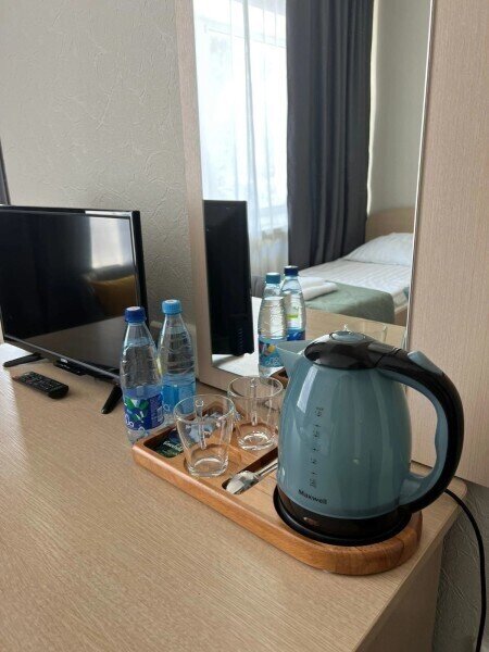 Небольшой номер, выполненный в серо-зеленых тонах, располагающий всем необходимым для комфортного отдыха