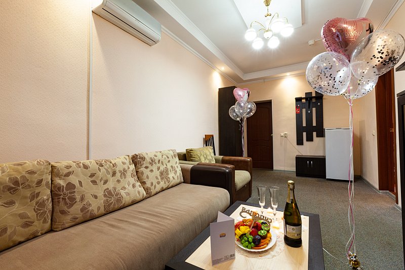 Комфортабельны двухкомнатный номер категории «Люкс» подмосковного Пансионата «Парус» оптимально подойдет для проведения выходных с детьми и семьей в Подмосковье. Он разделен на несколько зон и рассчитан на проживание двух-четырех гостей. Удобная планировка номера пансионата позволяет использовать часть номера как гостиную, где можно с удовольствием отдохнуть в конце насыщенного впечатлениями дня на удобном диване, устроить семейный просмотр фильма, а также принимать гостей. Диван можно использовать как дополнительное спальное место. Кроме того, в номере пансионата имеется рабочая зона, а также будуар, который станет приятным сюрпризом для дам. Спальня оборудована большой двуспальной кроватью, телевизором с плоским экраном, шкафом и прикроватной тумбочкой, холодильником. Гостиная оснащена диваном, стенкой, большим жк телевизором. Преимуществом номера «Люкс» в подмосковном пансионате «Парус" является современный и стильный дизайн, а так же высокий уровень комфорта. Кроме того в номерах данной категории установлены чайные наборы.