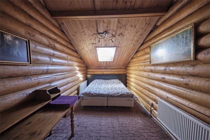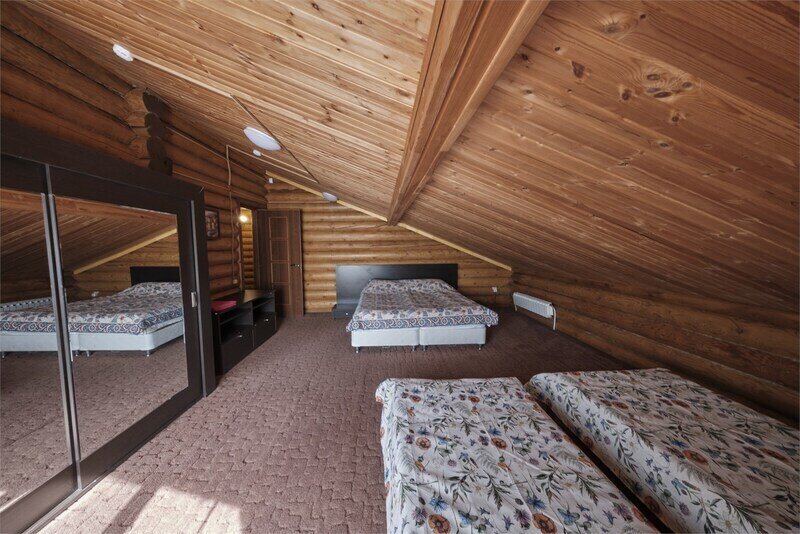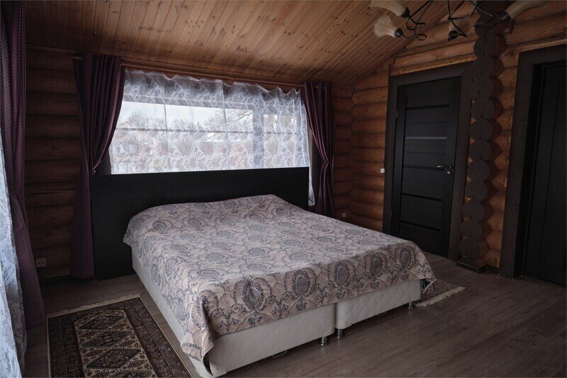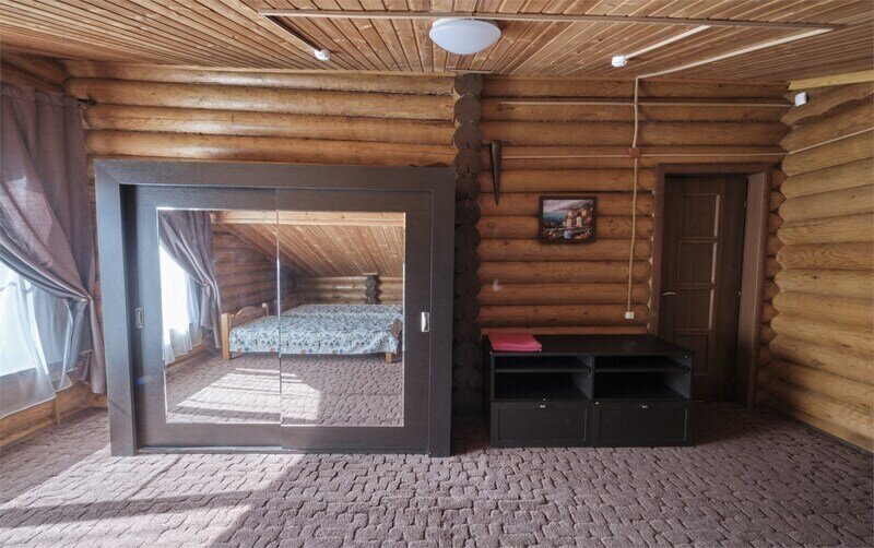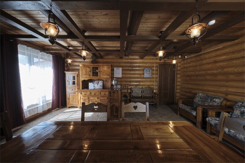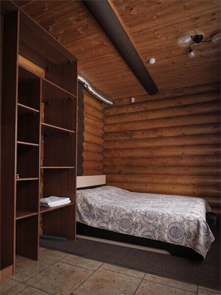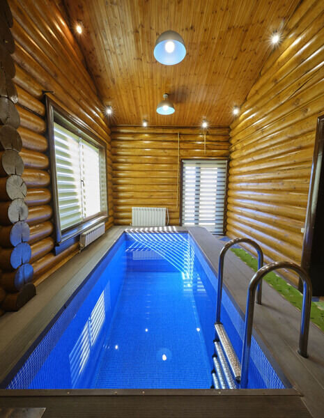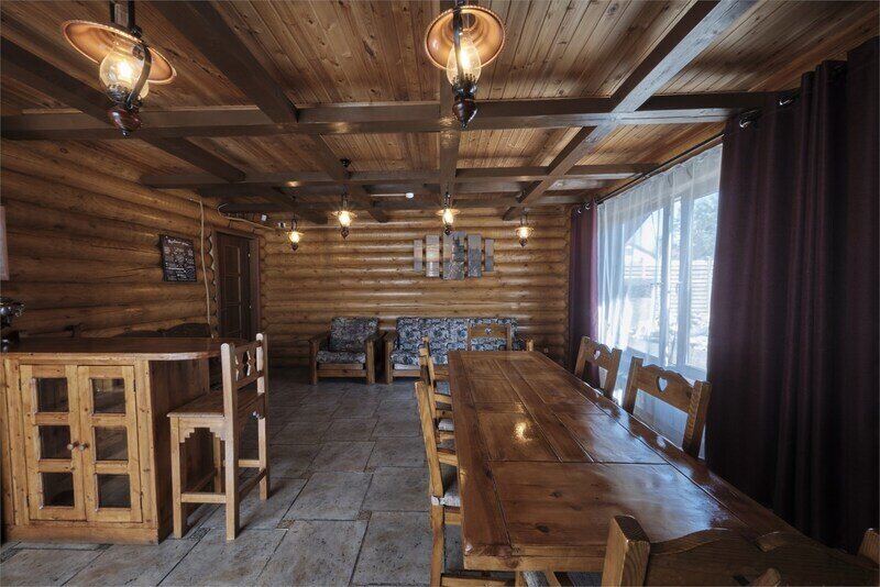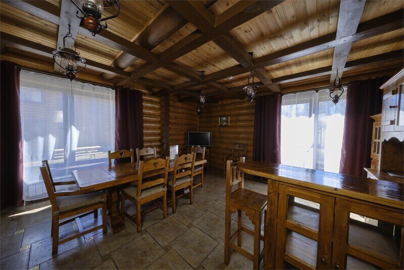 Баня на дровах расположена в шале. Помимо русской бани шале оборудован небольшим бассейном. Русская парная рассчитана на 8 человек.