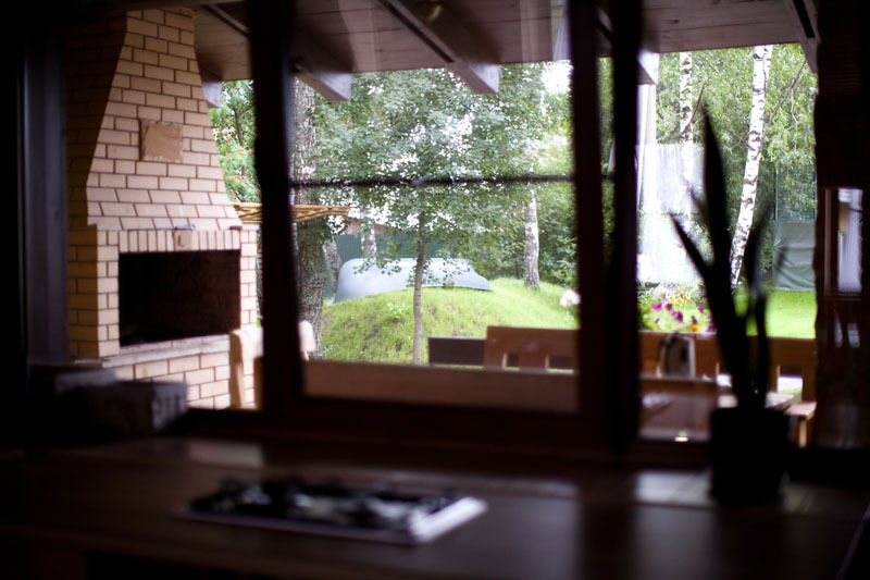 На первом этаже второго здания находятся гостиная с камином, кухня, телевизор, музыкальный центр, мягкие кресла, угловой диван, обеденный стол, санузел, ванная, на веранде барбекю. На втором этаже четыре спальни, два санузла. Комфортное размещение 14 человек, максимальное 21 человек.